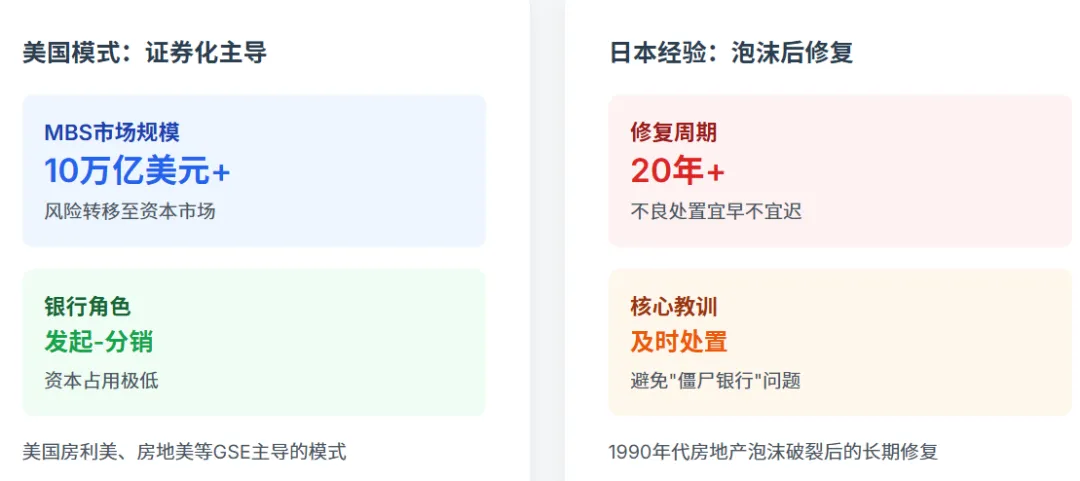 日本1990年代房地产泡沫破裂后,银行业经历了长达二十年的修复期。核心教训包括:不良处置宜早不宜迟,拖延确认和处置导致"僵尸银行"问题,拖累整体经济;政府需及时介入,设立整理回收机构(RCC)收购不良资产,注入公共资金充实银行资本。