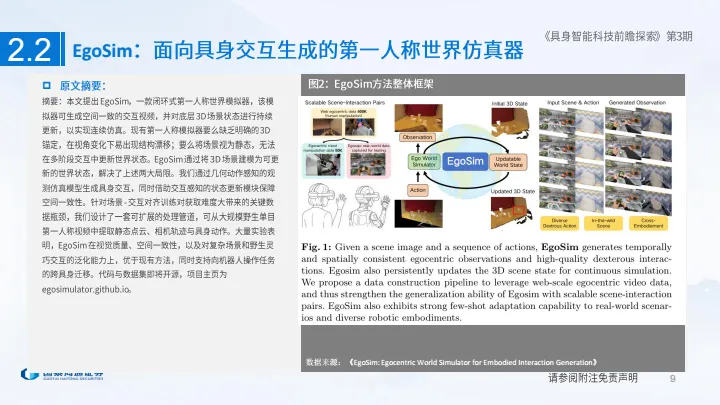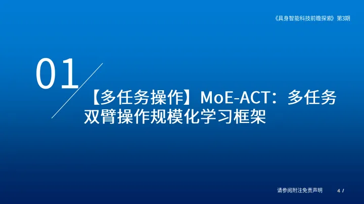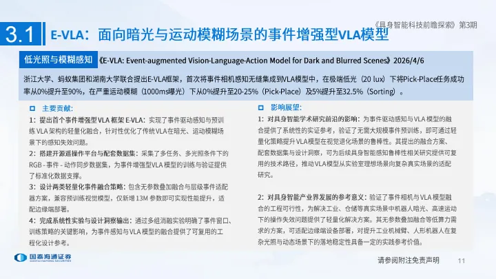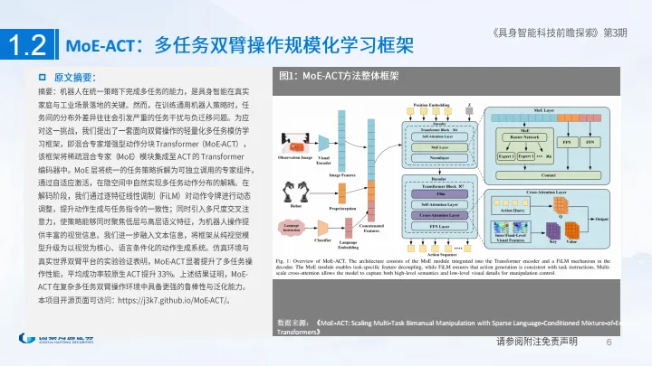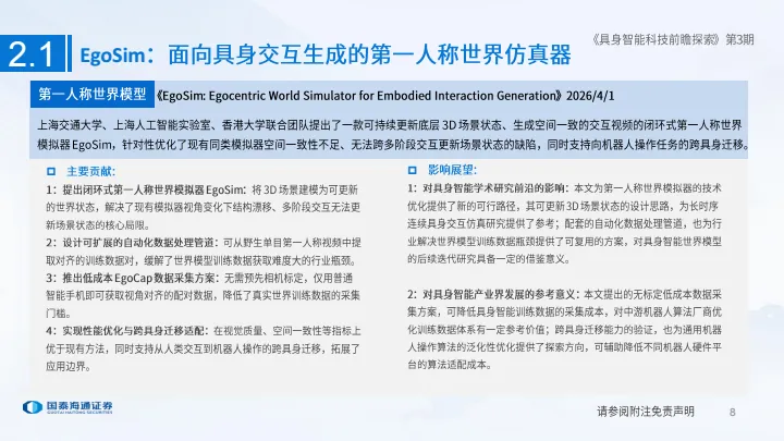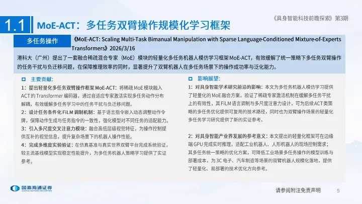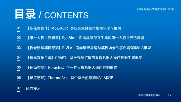 摘要:本报告聚焦具身智能六大前沿技术,覆盖多任务双臂操作、第一人称世界模型、低光照模糊感知、仿真数据生成、人形机器人通用控制、热感知VLA。MoE-ACT实现多任务解耦,成功率提升33%;EgoSim构建第一人称闭环仿真,支持跨具身迁移;E-VLA融合事件相机,暗光与运动模糊场景性能大幅提升;CRAFT通过视频扩散生成双臂操作数据;Heracles统一精准跟踪与抗扰恢复;ThermoAct首次融入热感知。成果均来自顶尖机构,已开源验证,为人形机器人、工业机械臂落地提供关键技术支撑,提示研发与商业化不及预期风险。