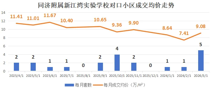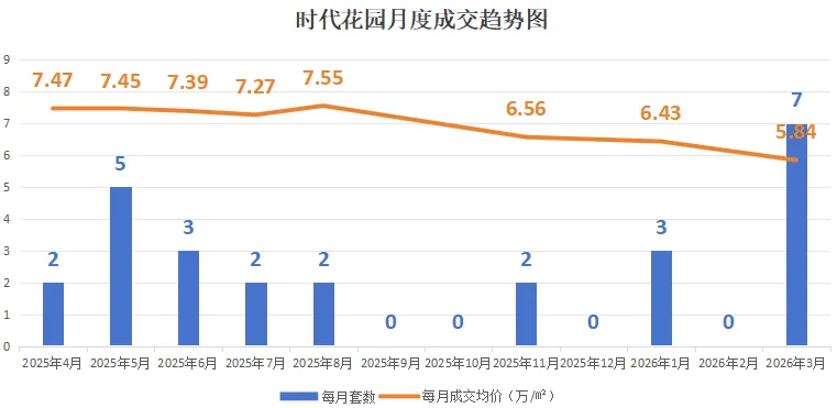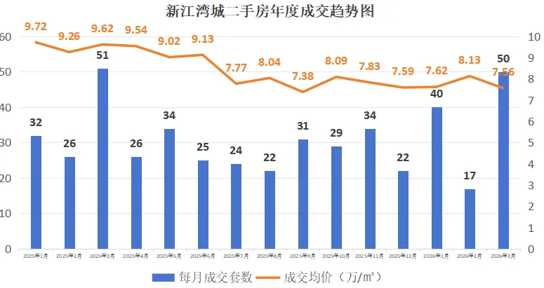 从25年4月以10.35万/㎡高位开局,一路震荡下行,8月探底8.36万/㎡后出现阶段性小反弹,26年1月再探低点7.36万/㎡。3月成交放量,价格小幅回升,筑底企稳、温和修复。