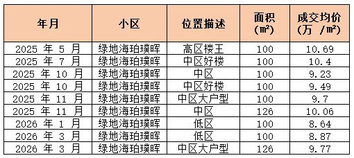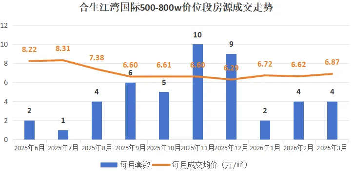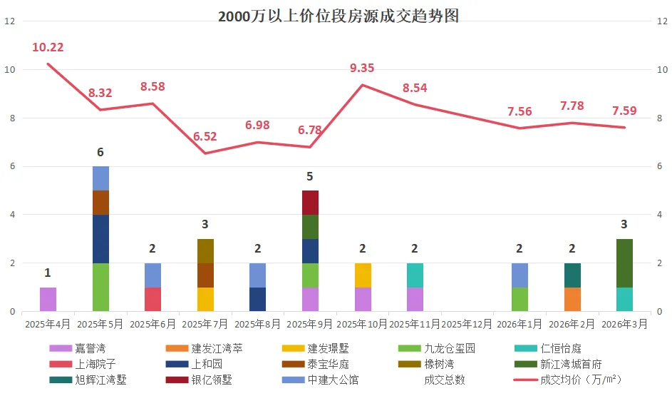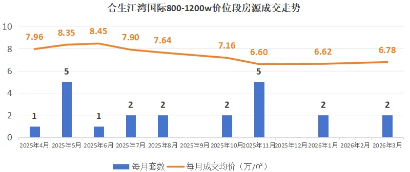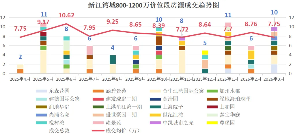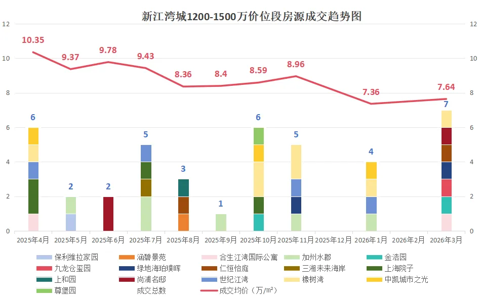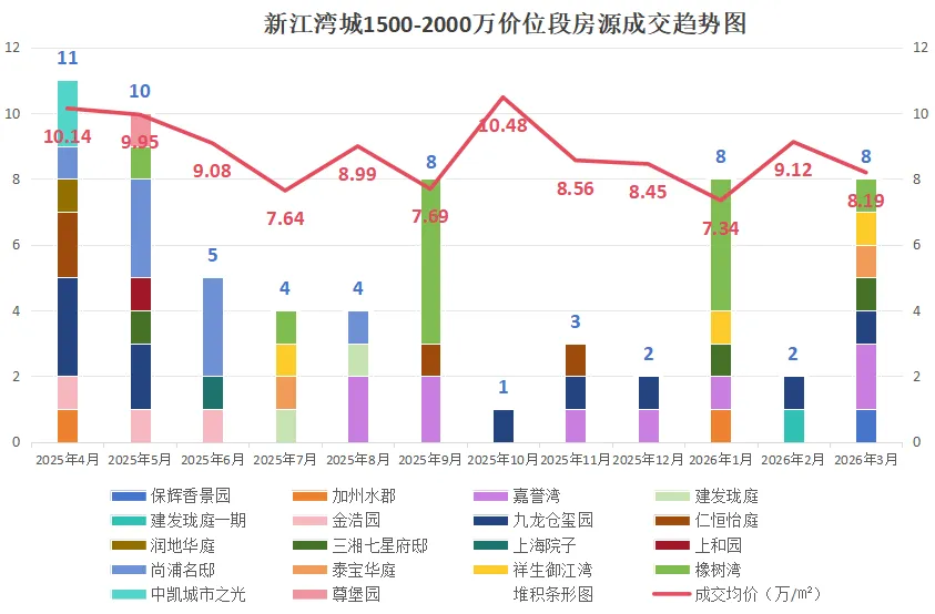 该价位段上半年一路下行,7月探底7.64万/㎡后短暂反弹又回落,10月成交缩量价格回弹至高位后持续下行,26年1月跌至全年最低点,3月成交放量价格稍回暖,仍处于底部震荡、弱企稳,未形成持续反弹趋势。