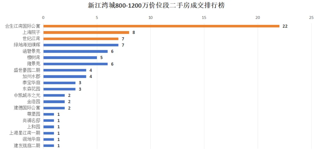 该价位段近一年成交87套:合生江湾国际22套,上海院子8套,世纪江湾、绿地海珀璞晖各7套,橡树湾5套。由“主力盘筑底+学区盘托底+品质盘修复”共同作用,带动企稳。