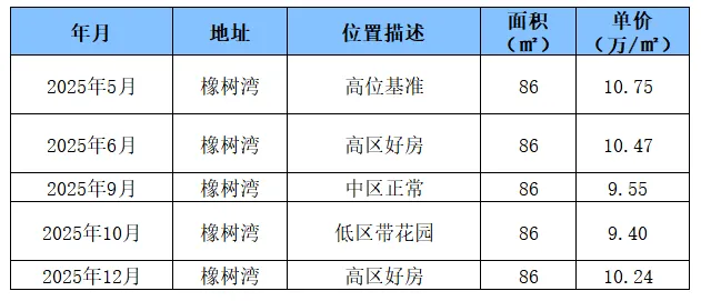 橡树湾在该价位段主要是86㎡左右的两房、小三房。其自6月价格高点10.47万/㎡回落,到12月出现反弹,快速收复跌幅。