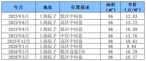 该价位段的上海院子经历了冲高、持续回落、低位磨底的过程,1月探底9.94万/㎡后在10.2-10.3万/㎡区间震荡,进入企稳修复。