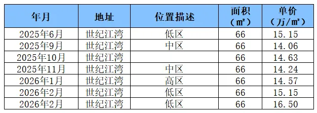 世纪江湾是新江湾城稀缺学区改善盘,该价位段是66㎡房源,价格始终维持14-16万/㎡超高位,9月受板块其他楼盘影响、学区淡季等多重因素影响出现阶段性低点,随后快速回弹。2月受学区需求影响,价格再度冲高。充分印证了其学区资产的强韧性与稀缺性。