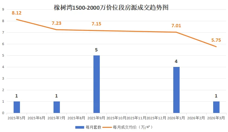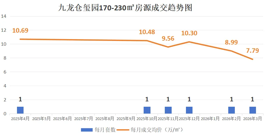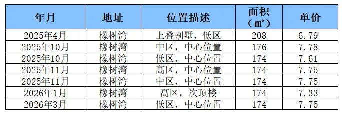 该价位段的橡树湾房源为174㎡的3+1房型,价格从去年4月起一路稳步上行,26年1月短暂下探后,3月反弹回7.75万/㎡,全程无大幅下跌,抗跌性强。