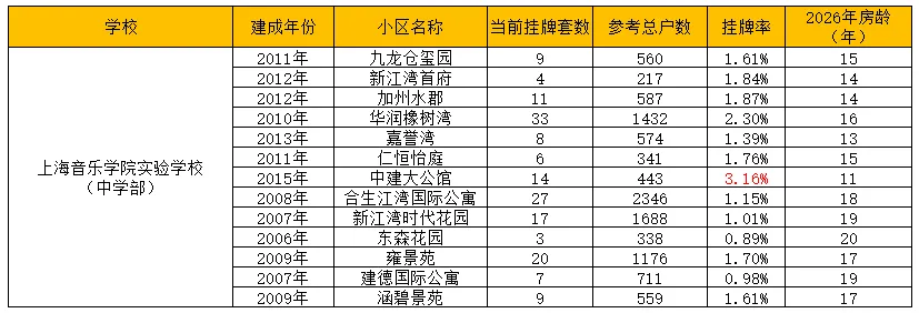 上音实验对口小区平均房龄16年,由次新+老小区混合为主,平均挂牌率1.64%。