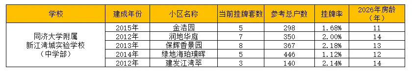 同济附属新江湾实验学校对口5个小区,平均房龄12.8年,房龄较新,平均挂牌率1.82%。