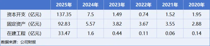 2025年,公司资本开支高达137.35亿元,同比激增1732%;固定资产达到92.83亿元,同比激增1567%;在建工程为33.47亿元,同比激增1996%。