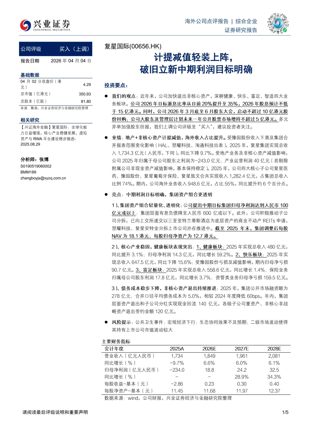 研报 |兴业证券:计提减值轻装上阵,破旧立新中期利润目标明确近日,兴业证券发布了关于复星国际的研究报告,摘要如下:近年来,公司加快退出非核心资产, 深耕健康、快乐、富足、智造四大业务板块。公司 2026年目标派息比率从目前20%提升至35%, 2026年股息预计不低于 15亿港元。同时,公司 2026年3 月底至6月股东大会,启动不超过10亿港元股份回购; 公司大股东及管理层计划未来一年公开股票市场增持不超过5亿港元。多元并举加强股东回报, 我们上调公司评级至"买入", 建议投资者关注业绩:地产+非核心资产计提减值,海外收入占比提升。受豫园股份收入下滑及集团合并报表范围变化影响(HAL、翌耀科技、淘通科技出表)2025年, 复星集团实现总收入1,734.3亿元( 人民币,下同), 同比下降9.7%。受地产业务及非核心资产减值影响,公司2025年归属于母公司股东之利润为-243.0 亿元; 产业运营利润 40 亿元(若剔除附属公司非现金资产减值影响,基本保持稳定)。2025年,公司四大核心子公司复星医药、豫园股份、复星葡萄牙保险、复星旅文合共实现收入1,282.4亿元,占集团总收入比例74%期内,公司海外业务收入 948.6 亿元, 占比55%, 同比提升约6个百分点。1 )集团资产组合轻量化、透明化 : 公司提出中期目标集团归母净利润达到人民币100亿元或以上; 集团层面有息负债降至人民币 600 亿或以下。此外, 公司积极推动子公司分拆, 已向上交所递交以三亚亚特兰蒂斯酒店为底层资产的商业不动产REITSs申请,翌耀科技、复星安特金分拆上市公司亦在推进中。截至 2025 年末, 集团调整后每股NAV为 18.1 港元; 每股归母净资产为 12.7港元。2 )、核心产业稳固, 健康板块表现突出: 1 、健康板块: 2025年实现总收入480亿元,同比提升3.1%; 归母净利润 14.3亿元, 同比增长59.2% 。2、快乐板块 : 2025年实现总收入647.5 亿元, 同比下降 15.6%, 受豫园股份亏损及减值影响,期内归母净亏损90.7亿元。 3、富足板块 : 2025年实现总收入558.6亿元, 同比增长 1.4% ; 保险业务归属母公司股东利润 17.8亿元, 同比增长3.7%, 资管类业务归母净亏损 159.5亿元。3) 债务成本稳步下降, 非核心资产退出持续推进 : 2025年, 集团公开市场融资额为278 亿元; 合并口径平均债务成本为 5.0%, 相较2024年度降低60bps 年内, 集团层面资产退出和子公司分红实现现金回流 140 亿元, 各级子公司重资产、非核心非战略资产退出签约金额 120 亿元。风险提示: 公共卫生事件; 宏观经济下行; 生态协同效果不及预期; 二级市场波动使得其持有上市公司市值波动较大