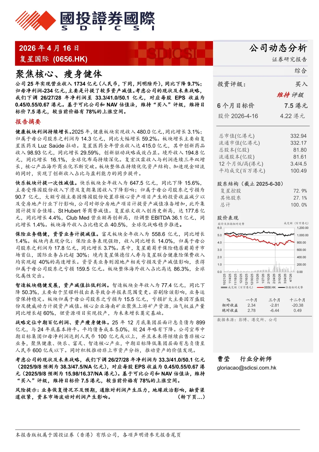研报 |国投证券国际:聚焦核心、瘦身健体近日,国投证券国际发布了关于复星国际的研究报告,摘要如下:公司 25 年实现营业收入 1734 亿元(人民币,下同,列明除外),同比下降 9.7% ;归母净利润-234 亿元,主要是计提了较多资产减值。考虑公司的现状及未来战略,我们下调 26/27/28 年净利润至 33.3/41.0/50.1 亿元, 对应每股 EPS 收益为0.45/0.55/0.67 港元。基于可比公司和 NAV 估值法,维持“买入”评级,维持目标价 7.5 港元,较当前价格有 78%的上涨空间。健康板块利润持续增长。2025 年,健康板块实现收入480.0 亿元,同比增长3.1%;归属于母公司股东之利润为14.3 亿元,同比大幅增长59.2%。板块增长主要由复星医药及Luz Saúde拉动。复星医药全年营业收入达415.0 亿元,其中创新药品收入98.93 亿元,同比增长29.59%,创新驱动战略成效凸显。境外收入194.8 亿元,同比增长16.1%,全球化布局持续深化。复宏汉霖收入与利润连续三年双增长,核心产品海外商业化不断突破。板块整体在持续优化资产结构、加速现金回流的同时,实现了创新收入占比与盈利能力的同步提升。快乐板块计提一次性减值。快乐板块全年收入为647.5亿元,同比下降15.6%,主要受豫园股份收入下滑及复朗集团收入下降影响;归属于母公司股东之亏损为90.7亿元,大额亏损主要因豫园股份处置非核心资产项目产生的投资收益减少以及受房地产行业下行影响,公司对部分房地产项目计提资产减值准备增加,此外集团计提百合佳缘、St Hubert等商誉减值。复星旅文收入创历史新高,达177.6 亿元,同比增长4.4%,Club Med营业额再创新高,经调整EBITDA 36.1亿元,同比增长1.4%。板块海外收入占比稳定在40.5%,全球化战略稳步推进。保险业务稳健,资管业务计提减值。富足板块全年收入为558.6 亿元,同比增长1.4%。板块内表现分化:保险业务表现强劲,收入同比增长14.0%,归属于母公司股东之利润为 17.8 亿元,同比增长 3.7%。其中, 复星葡萄牙保险稳居葡萄牙市场首位, 国际业务占比超30%;境内复星保德信人寿与复星联合健康险保费收入均实现超40%的高速增长。资管类业务则因地产相关亏损及资产减值影响, 录得归属于母公司股东之亏损159.5 亿元。板块整体海外收入占比高达86.3%,全球化属性突出。智造板块稳健发展,资产减值拉低利润。智造板块全年收入为 77.4 亿元, 同比下降 50.3%,主要由于翌耀科技出表导致合并报表范围变更。若剔除该影响,业务运营保持稳定。板块归属于母公司股东之亏损为 15.5 亿元,亏损扩大主要因万盛股份及捷威动力计提资产减值。核心企业海南矿业聚焦上游矿产资源,油气权益产量同比增长超 60% ,锂资源项目实现投产,为未来增长奠定基础。战略定位中期百亿利润、资产瘦身健体。25 年12 月底集团层面计息负债为899亿元,与 24 年底基本持平。平均债务成本 5.0%,较 24 年略有下降。公司宣布中期目标集团归母净利润达到人民币100 亿元或以上,并且未来将继续出售非核心业务,聚焦健康、快乐、富足、智造核心产业,中期目标降低集团层面有息负债至人民币 600 亿或以下。 同时积极推动非上市资产分拆,推动资产的价值发现。考虑公司的现状及未来战略,我们下调 26/27/28 年净利润为 33.3/41.0/50.1 亿元(2025/9/8 预测为 38.3/47.5/NA 亿元),对应每股 EPS 收益为 0.45/0.55/0.67 港元(2025/9/8 预测为 15.98/16.37/NA 港元)。基于可比公司和 NAV 估值法,维持“买入”评级,维持目标价 7.5 港元,较当前价格有78%的上涨空间。风险提示:业务恢复情况不及预期,通胀对利润产生压力,地缘政治影响,融资渠道收紧,资本市场波动对利润产生影响。
