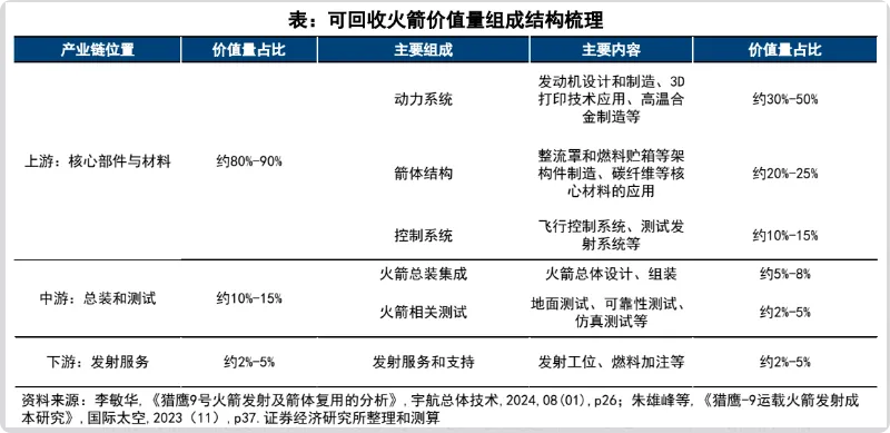 可回收产业链整体价值集中上游,而上游又以动力系统、箭体结构、电器设备领域为核心价值所在。
