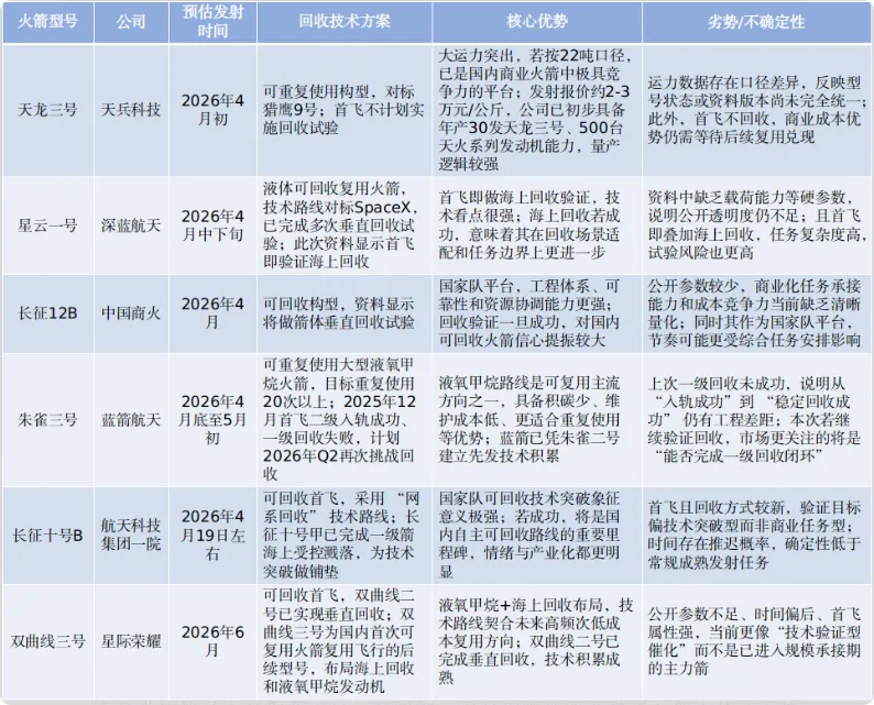 根据公开资料显示,2026年二季度天龙三号、星云一号、长征十二号B、朱雀三号、长征十号B、双曲线三号等将进行可回收首飞。