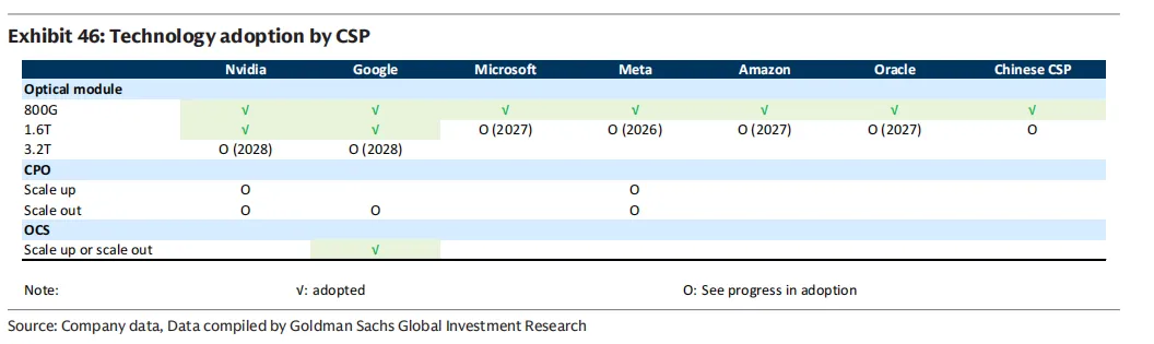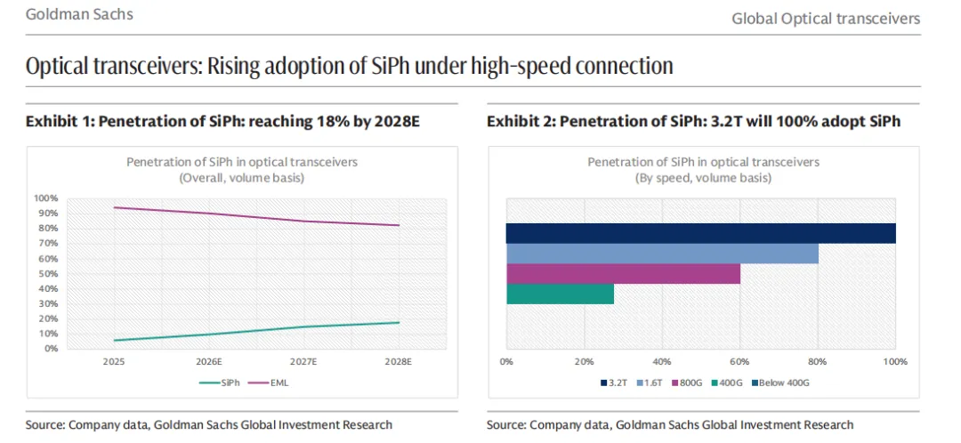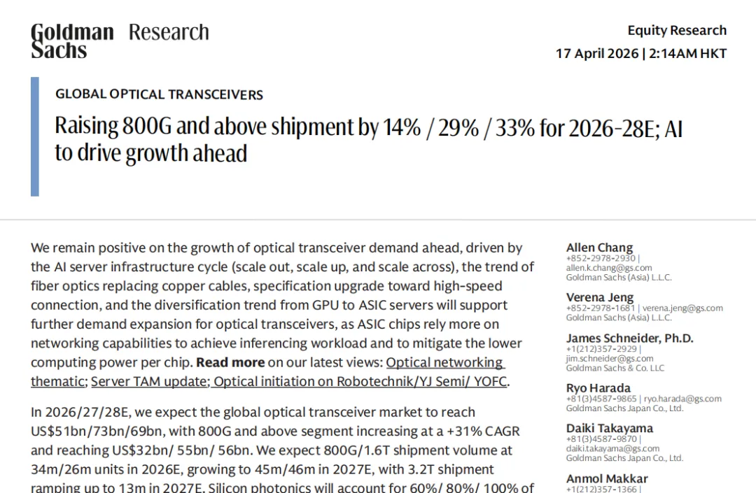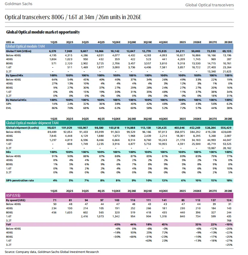高盛大幅上调2026-2028年全球光模块TAM至509/726/691亿美元,较此前预测分别上调18%/35%/40%;800G及以上高端市场CAGR达31%,2028年占总市场81%;硅光技术加速渗透,3.2T光模块将100%采用硅光;AI服务器(尤其是ASIC服务器)的扩张与单GPU光模块用量翻倍是核心驱动力。