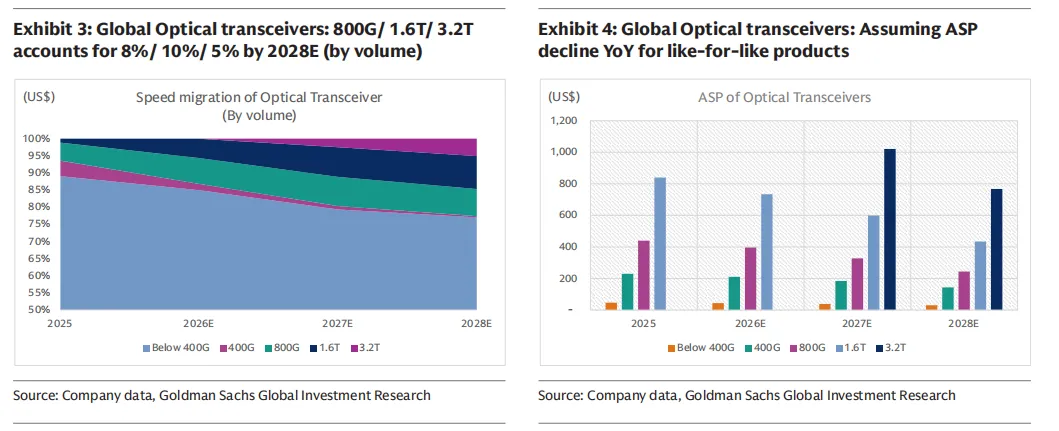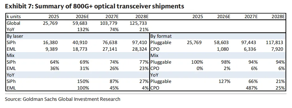 •800G+总出货量:2025年2577万只→2026年5968万只(+132%)→2027年10378万只(+74%)→2028年12573万只(+21%)。