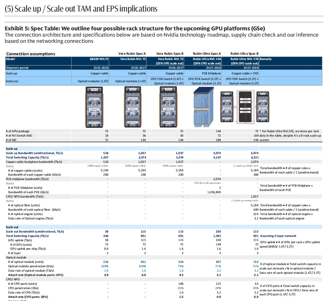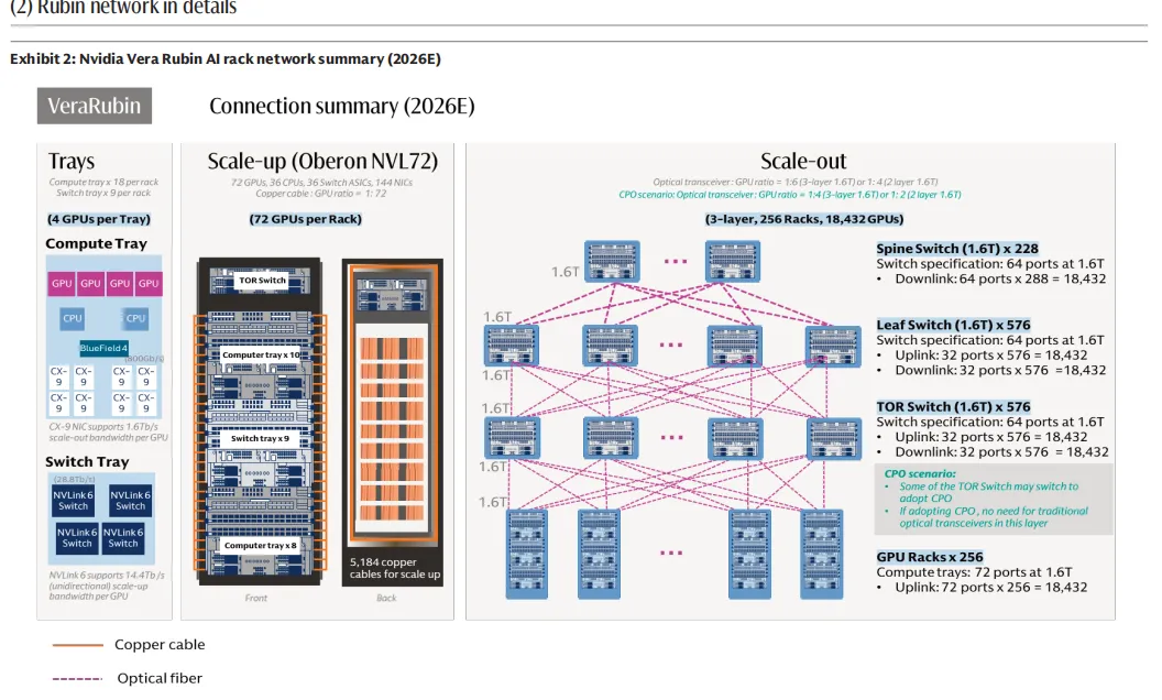 •Scale up:全铜缆连接,NVLink 6提供14.4Tb/s/GPU带宽