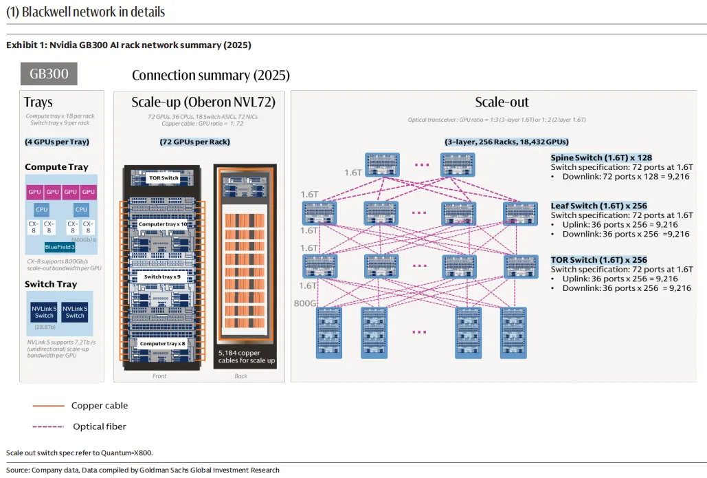 •Scale up:全铜缆连接,NVLink 5提供7.2Tb/s/GPU带宽
