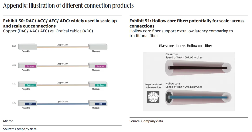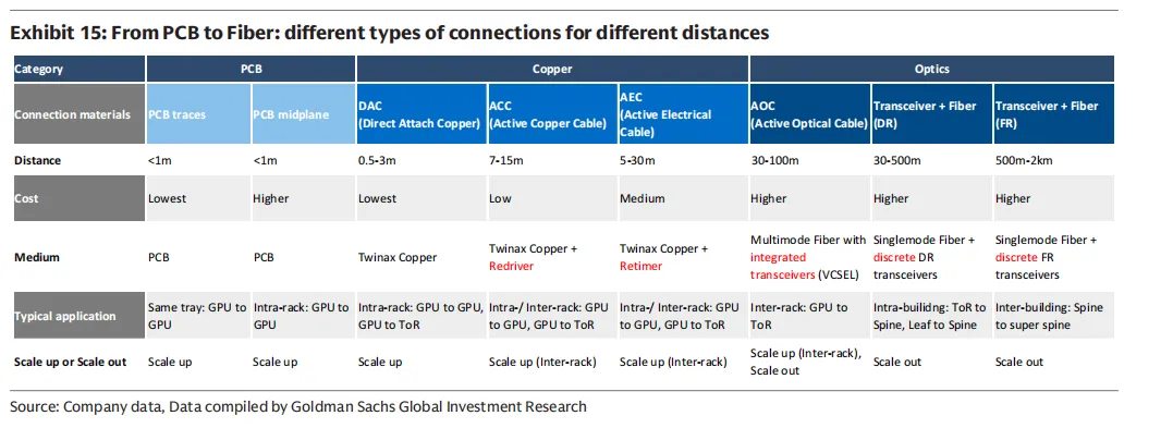 •趋势:铜缆向更长距离升级(DAC→ACC→AEC),PCB向机架内连接扩展,光模块向CPO/NPO演进覆盖短距离高带宽场景。