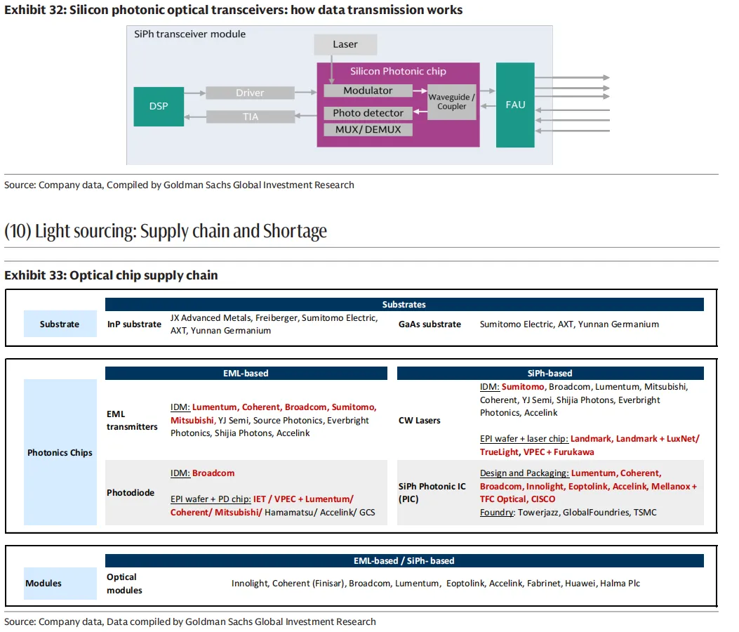 •英伟达生态:光引擎(中际旭创、新易盛、天孚通信)、FAU(FOCI、天孚通信)、CW激光(Sumitomo、Furukawa、Landmark、VPEC)、耦合/测试设备(罗博特科)