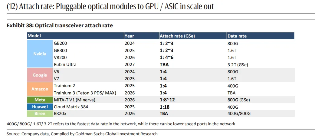 •ASIC服务器占比提升:2026年43%→2027年50%→2028年55%,ASIC芯片更依赖网络能力弥补算力不足,单芯片光模块用量高于GPU
