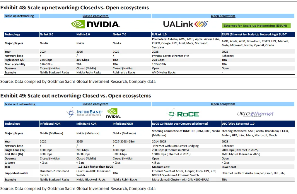 •开放生态:UALink(2025,支持1024GPU)、ESUN(2025,以太网为基础)
