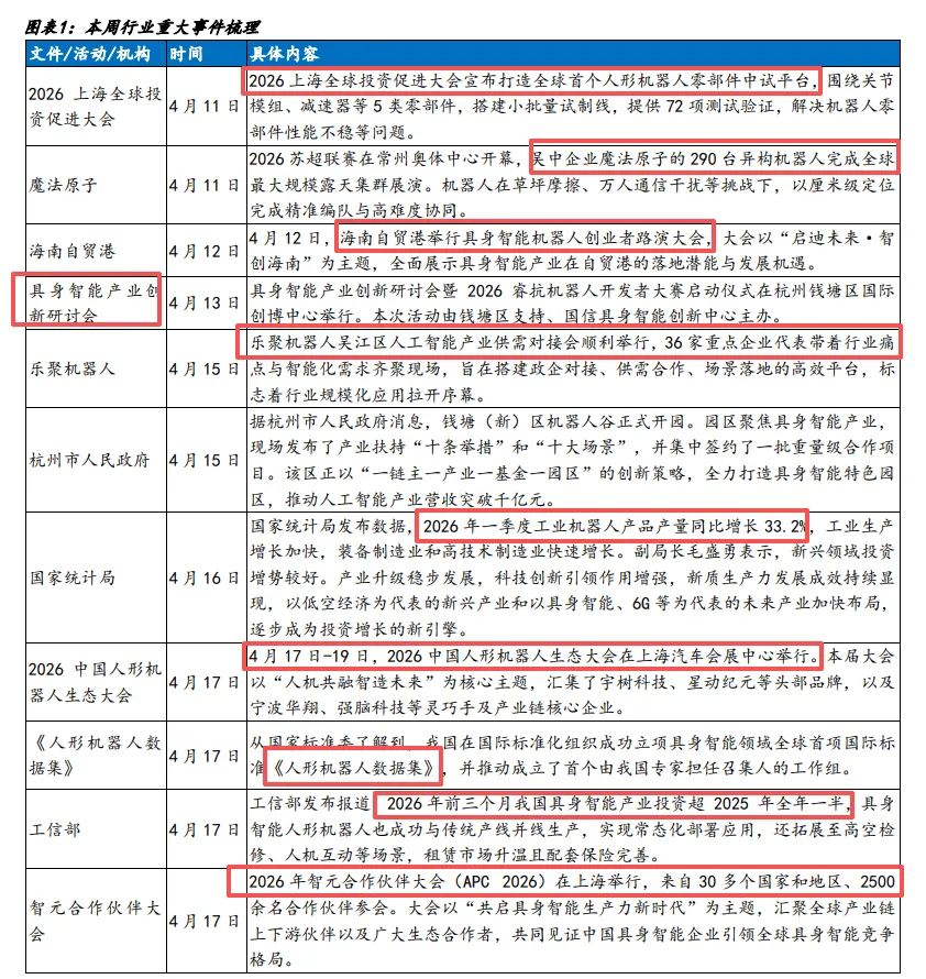 --26年前三月具身智能产业投资额已超去年半数。工信部发布报道,2026年前三个月我国具身智能产业投资超2025年全年一半,4月12日,智元远征A3完成全球首批客户交付,智元官方表示远征A3现有订单已全部锁定,上半年产能供不应求。同时,深圳首条人形机器人中试产线乐聚机器人正式启用,年规划产能覆盖500至1000台。