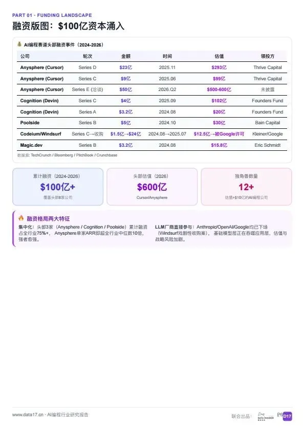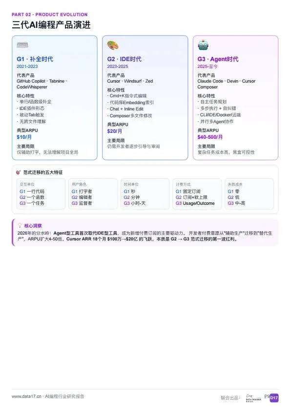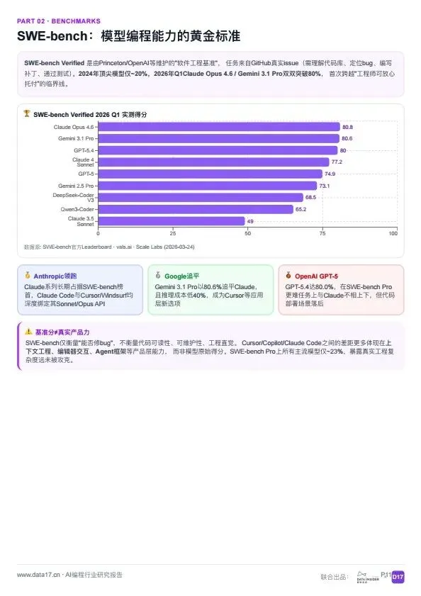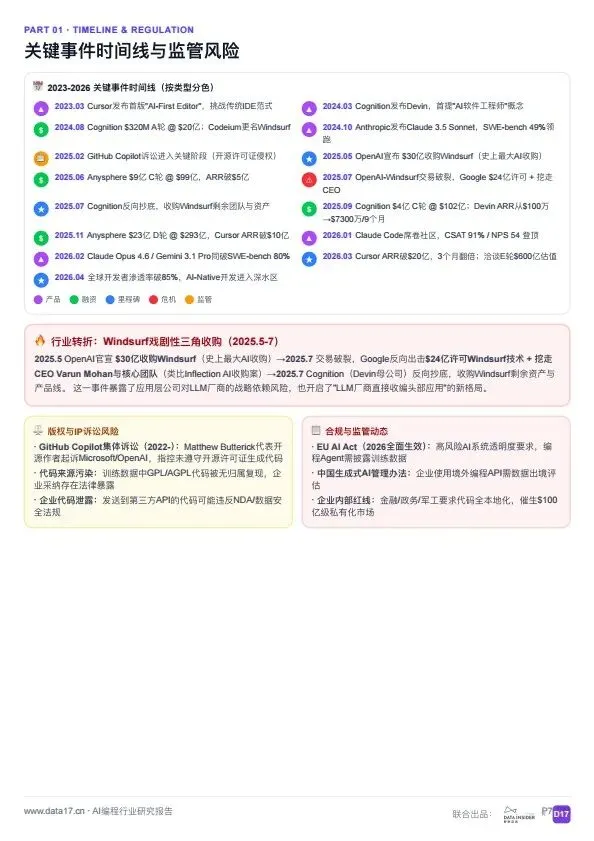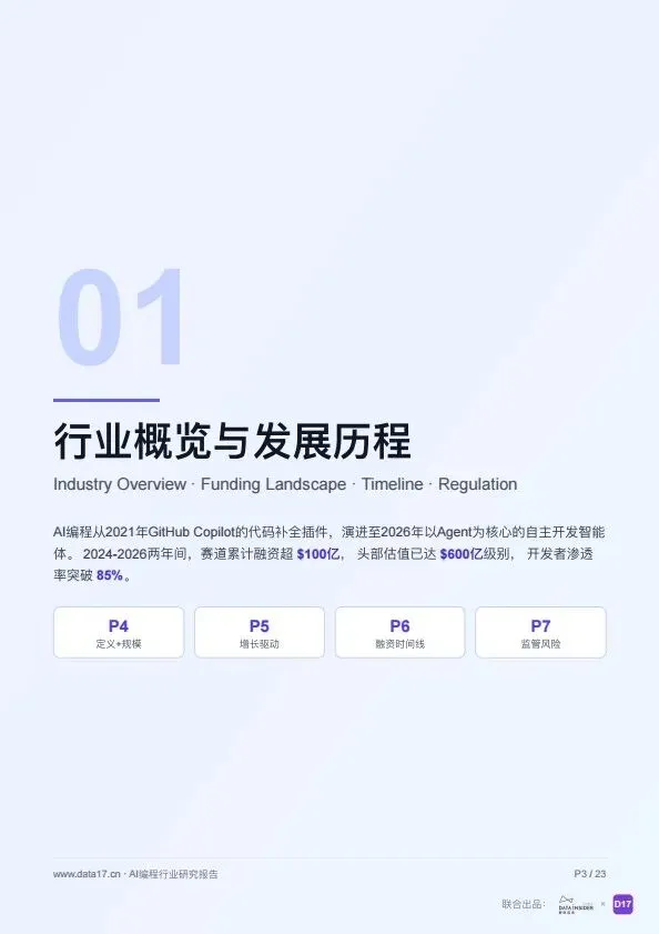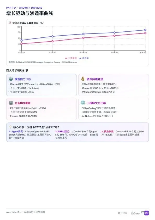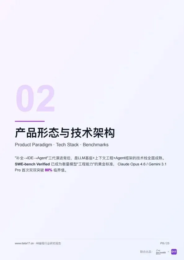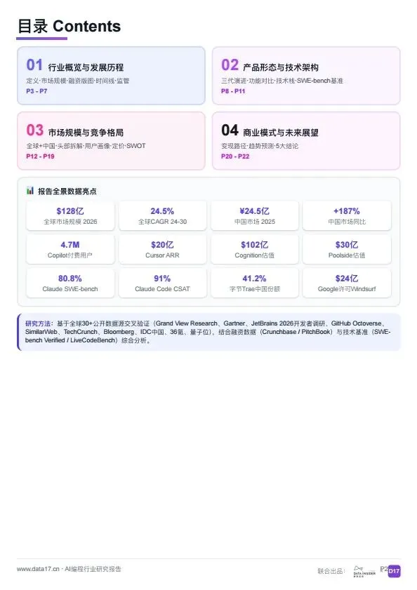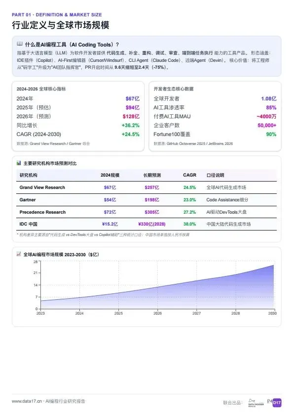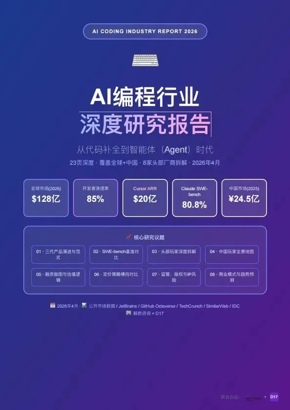 摘要:2026年AI编程行业进入Agent智能体时代,全球市场规模达128亿美元,CAGR24.5%;中国市场24.5亿元,同比增187%。行业历经代码补全、AI编辑器、自主Agent三代演进,ClaudeOpus4.6SWE-bench达80.8%,跨过商用临界点。全球形成Copilot、Cursor、ClaudeCode三足格局,CursorARR达20亿美元;中国由字节Trae以41.2%份额领跑。商业模式从订阅转向按任务/私有化部署,ARPU提升10倍。行业面临模型依赖、版权合规挑战,趋势指向Agent化、垂直化、私有部署与工程师人效重构。