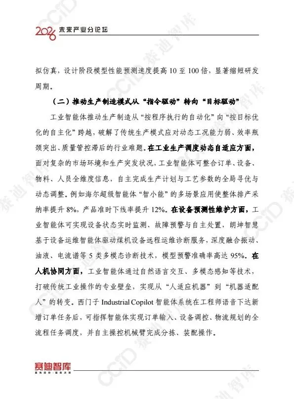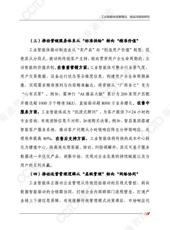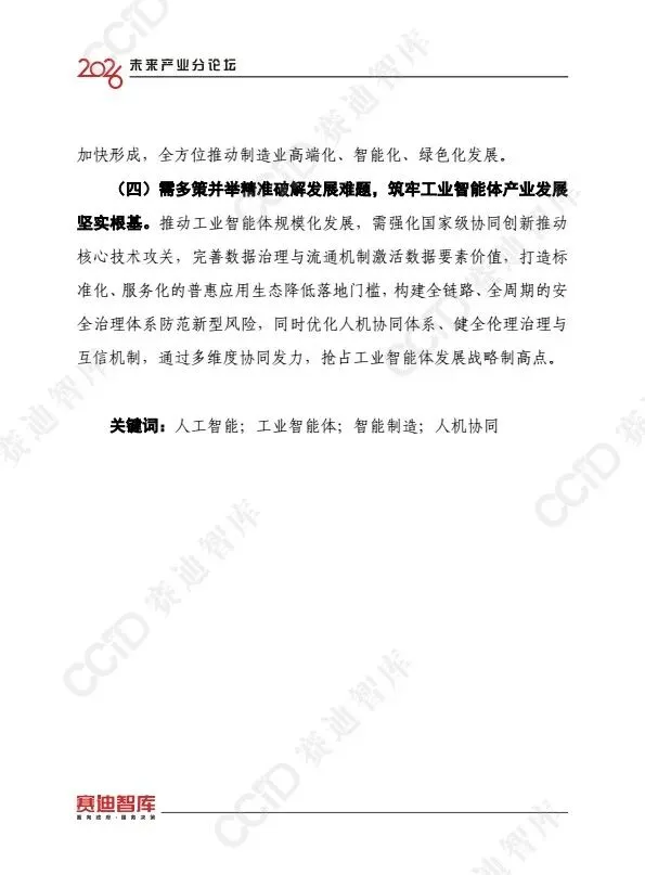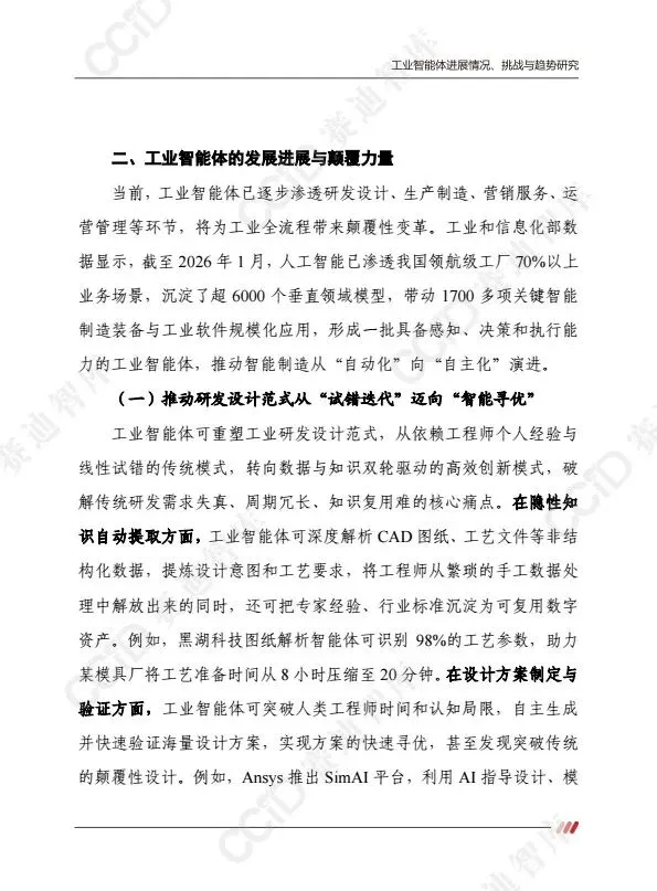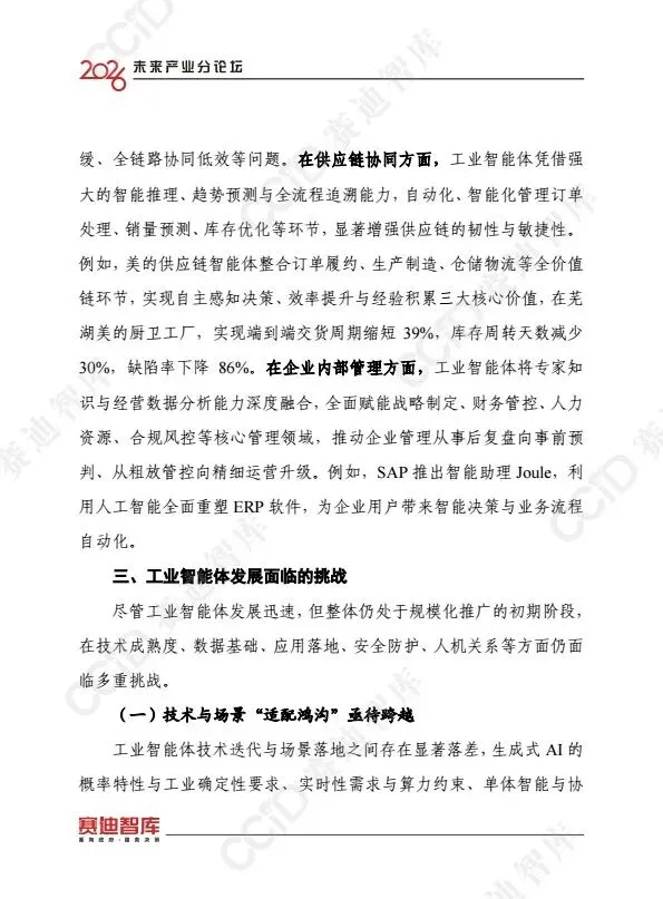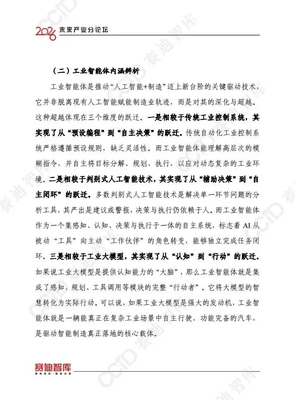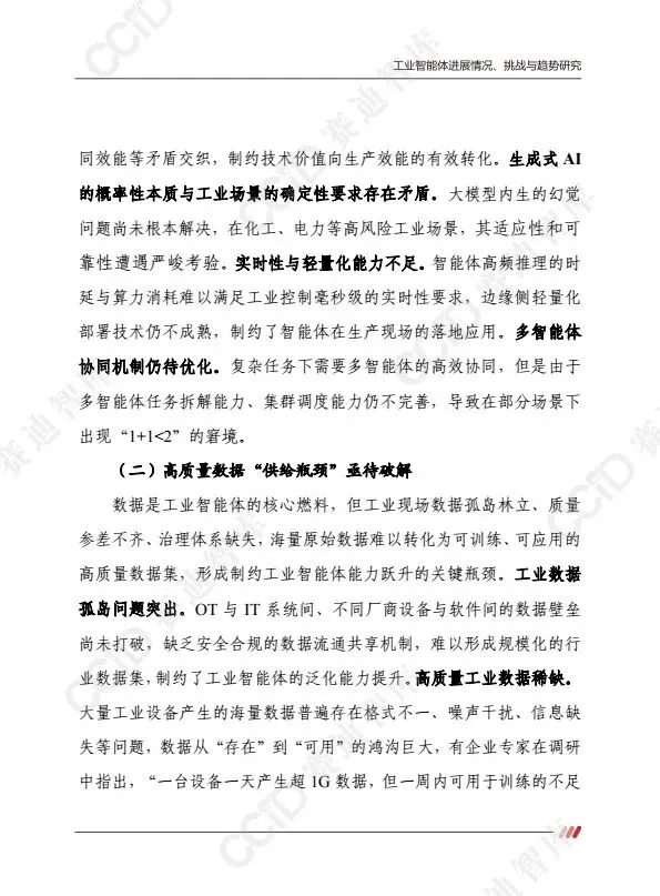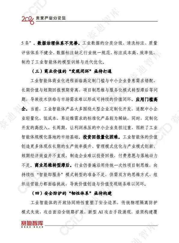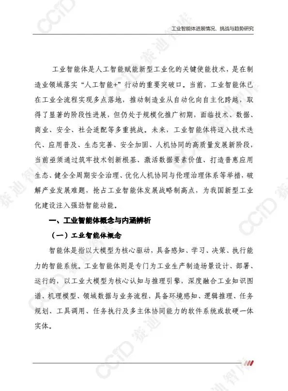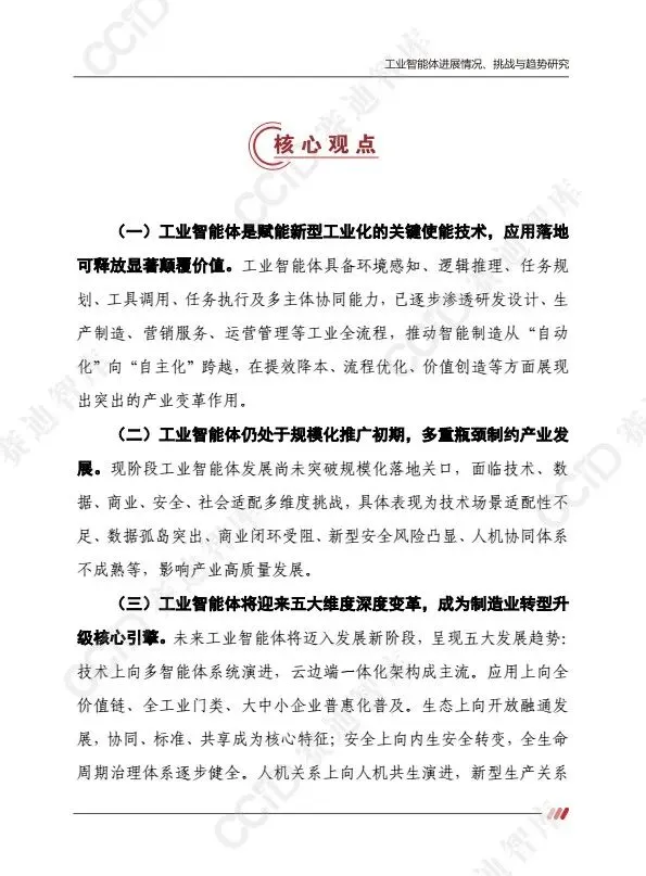 摘要:工业智能体是AI赋能新型工业化的关键技术,已渗透研发、生产、服务、管理全流程,推动制造从自动化向自主化跨越。当前处于规模化推广初期,面临技术场景适配不足、高质量数据短缺、商业闭环难、安全风险凸显、人机协同不成熟五大挑战。未来将沿五大方向演进:技术向多智能体与云边端一体化升级,应用向全价值链与中小企业普惠普及,生态走向开放协同,安全转向内生治理,人机迈向共生关系。建议从技术攻关、数据治理、普惠生态、安全体系、人机协同五方面发力,支撑产业高质量发展。