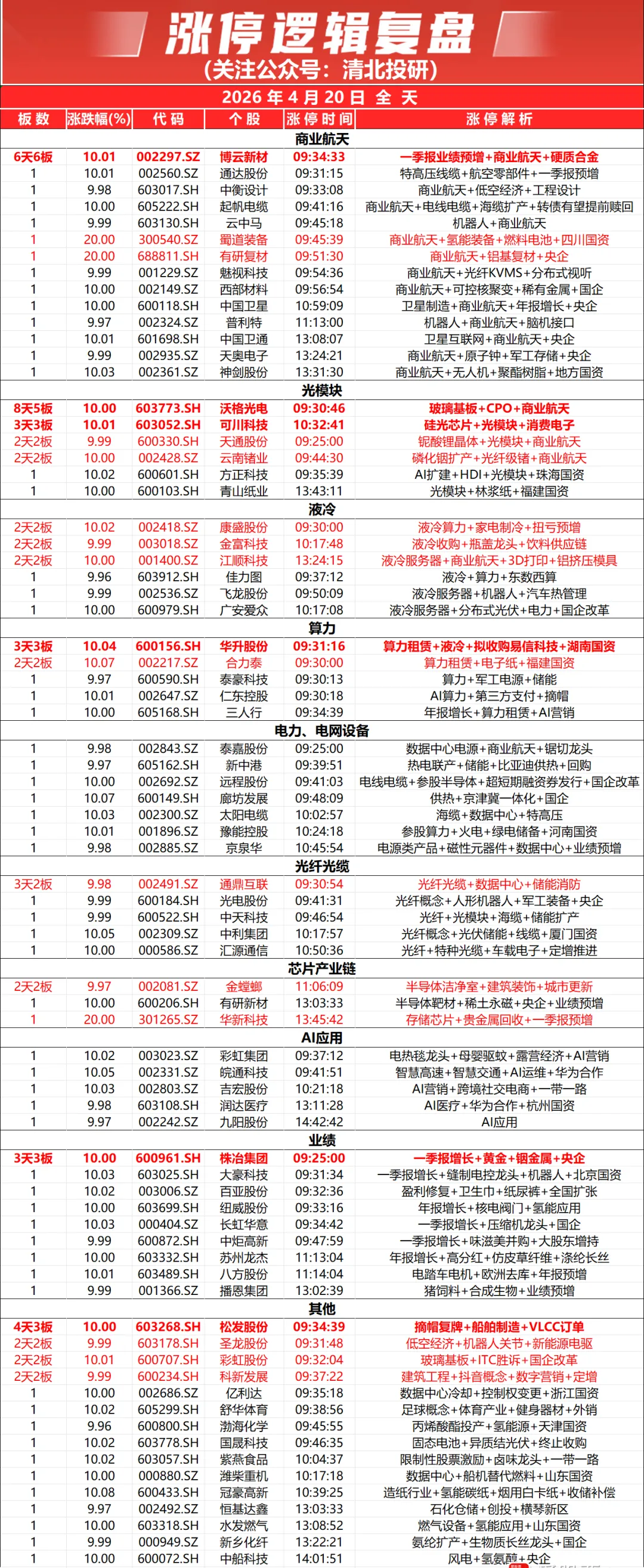 盘面上,商业航天概念全天强势,带动军工概念走强,光纤光缆、光模块、液冷、玻璃基板等AI硬件股持续活跃,海南板块午后震荡走强,电力、电网设备概念震荡走高;算力租赁概念走强,化纤板块走高。此外,工业气体、培育钻石、光伏设备等方向均有所表现。