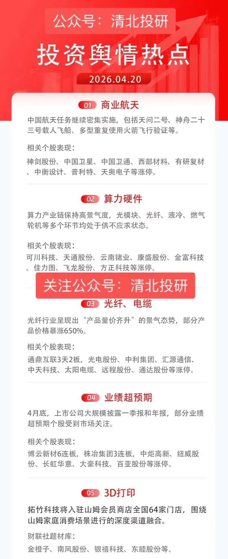 1、商业航天:国家航天局表示,中国航天任务继续密集实施,包括天问二号、神舟二十三号载人飞船、多型重复使用火箭飞行验证等。