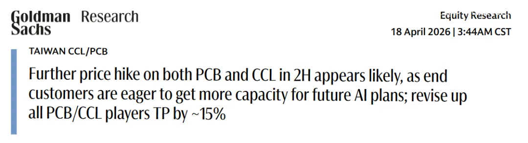 高盛-台湾CCLPCB:AI终端客户渴求更多产能支撑未来AI布局,下半年PCB与CCL有望再度涨价,全行业厂商目标价上调约15%-TAIWAN CCLPCB:Further price hike on both PCB and CCL in 2H appears likely,as end customers are eager to get more capaci-20260418【16页】