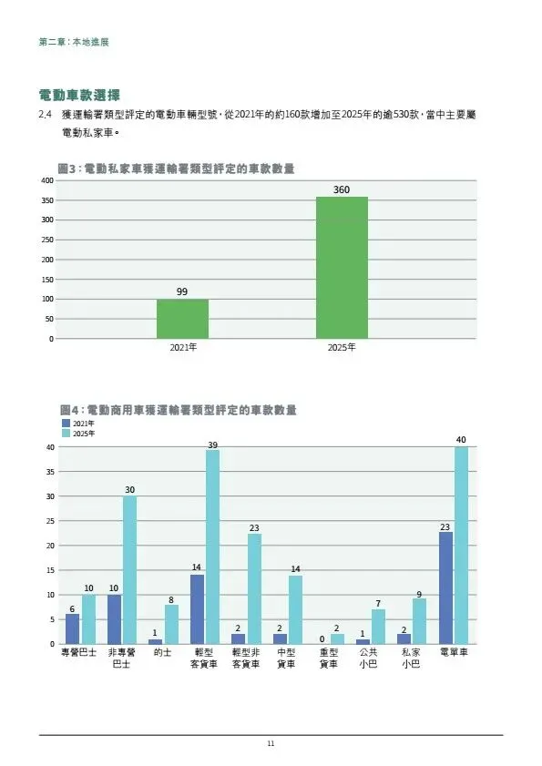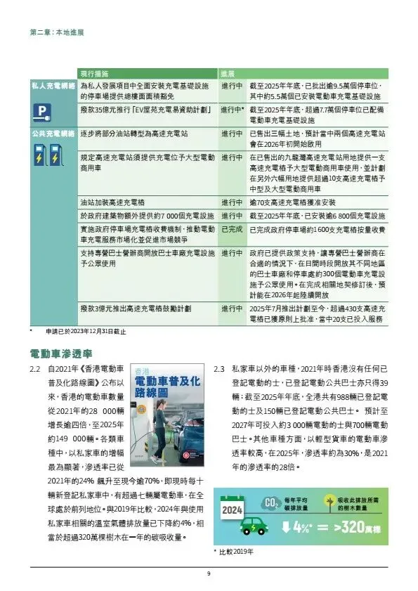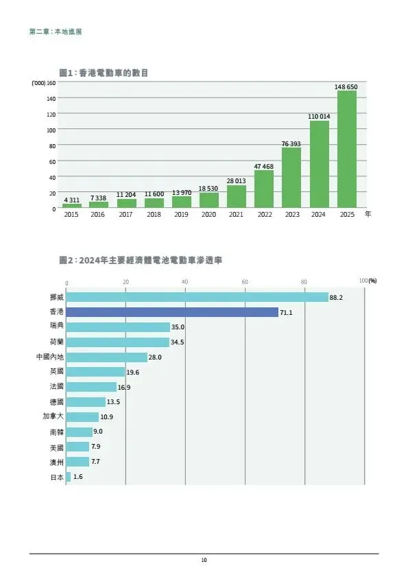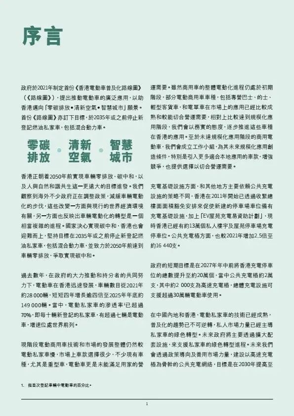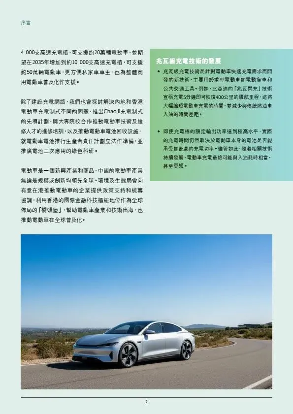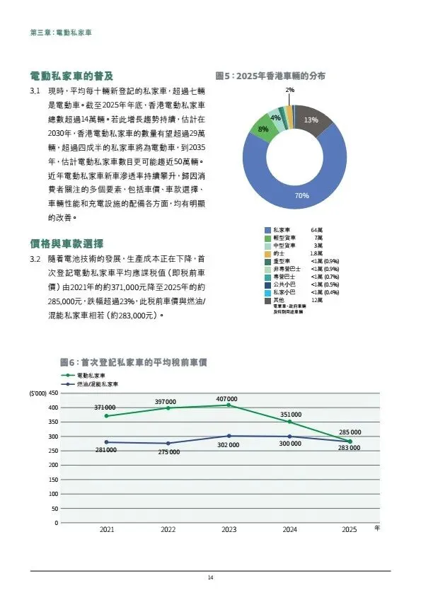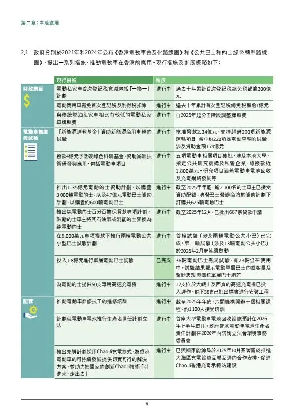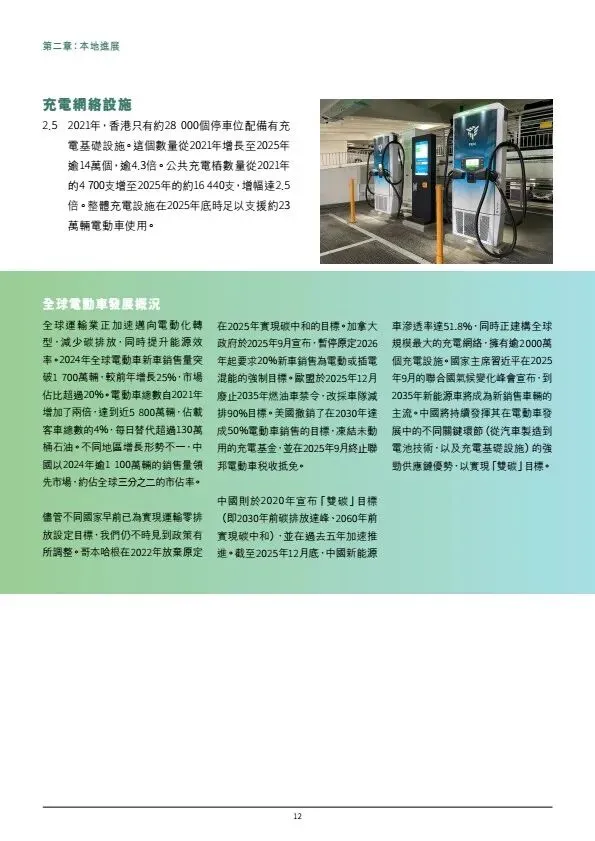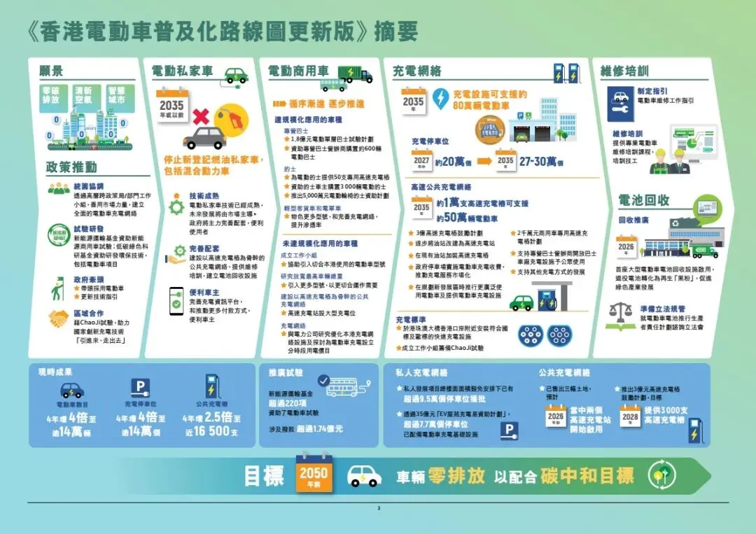 摘要:香港发布《电动车普及化路线图更新版》,坚持2035年前停止新登记燃油私家车,2050年车辆零排放。2025年底电动车达14.9万辆,电动私家车渗透率超70%。政策分领域推进:私家车由市场主导,政府完善配套;商用车辆聚焦巴士、的士、轻型客货车逐步电动化,重型车成立工作组推进。充电设施目标2027中达20万个车位、2035年高速桩1万支;推动油站改建快充、ChaoJi充电标准试点、电池回收与维修培训。依托内地产业优势,打造电动车出海桥头堡。