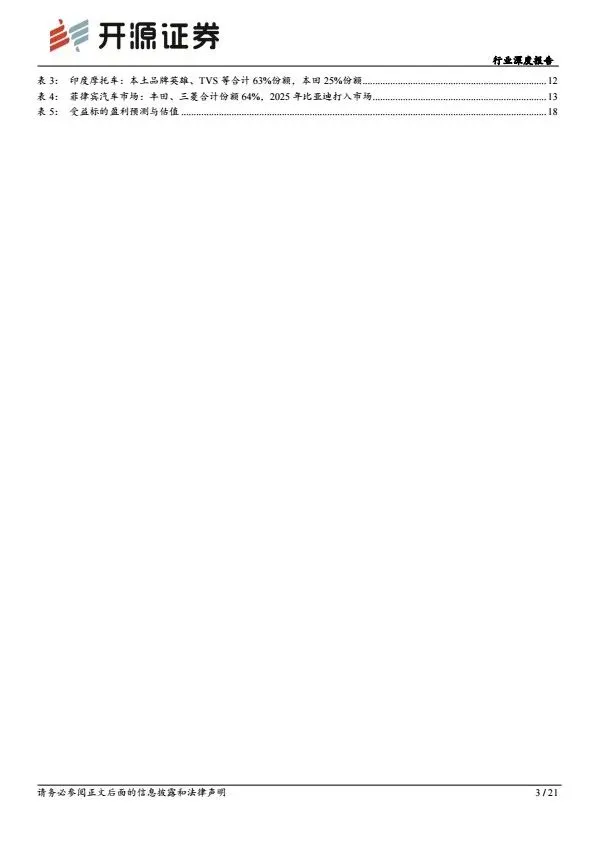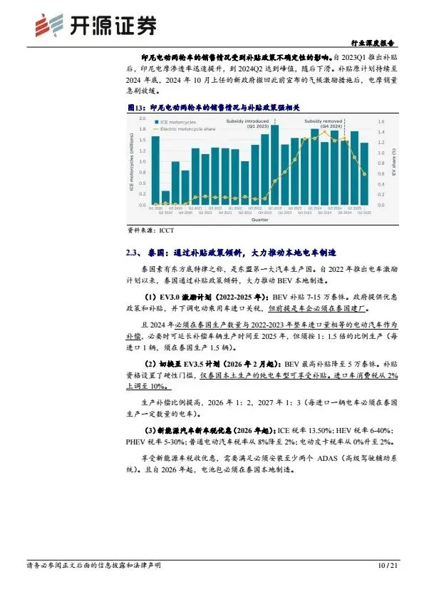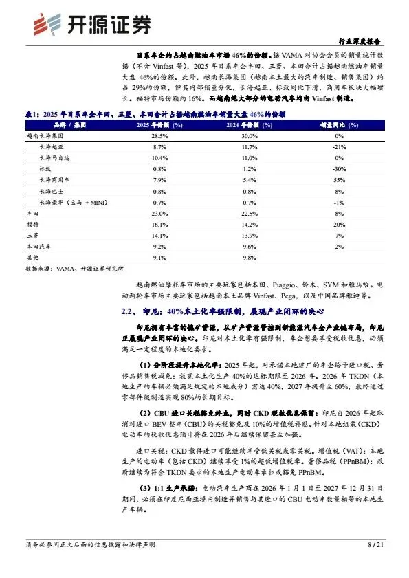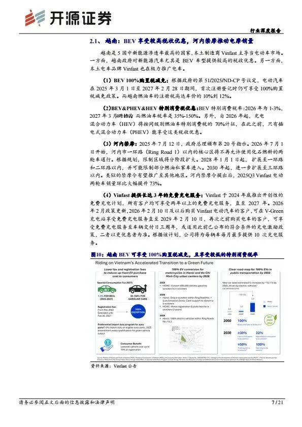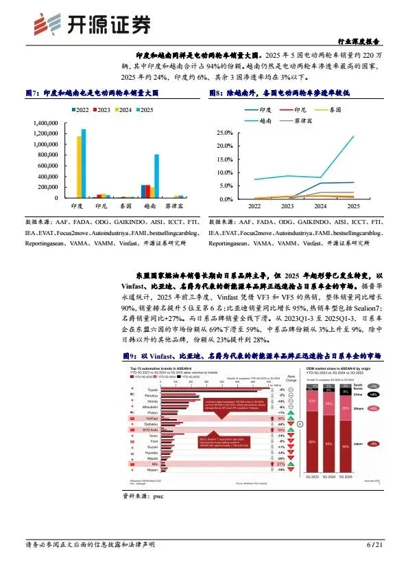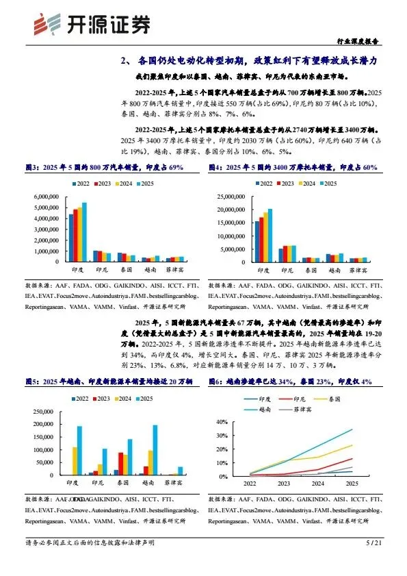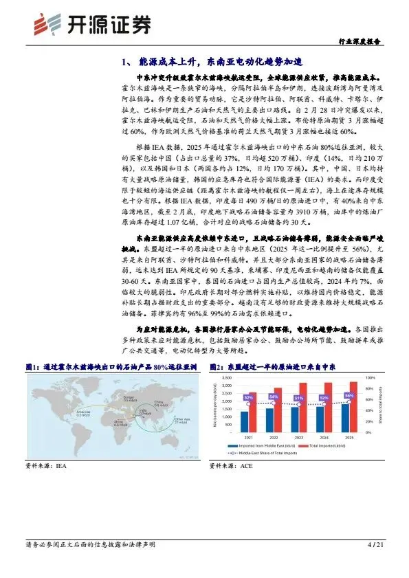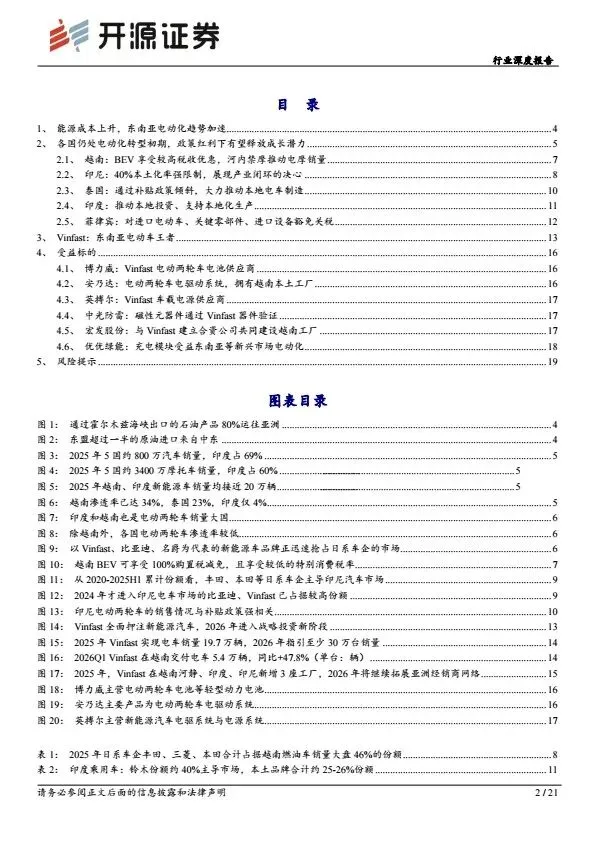 摘要:中东冲突推高能源成本,东南亚原油依赖进口、储备薄弱,电动化转型提速。越南、印尼、泰国、印度、菲律宾均处电动化初期,政策密集发力:越南免税+禁摩,印尼强推本土化,泰国补贴本土制造,印度激励投资,菲律宾零关税引产业。Vinfast为东南亚电动车龙头,2025年电车销量19.7万辆、电摩40.6万辆,2026年目标分别不低于30万辆、100万辆。产业链受益标的包括博力威、安乃达、英搏尔、中光防雷、宏发股份、优优绿能,提示销量与渗透不及预期风险。