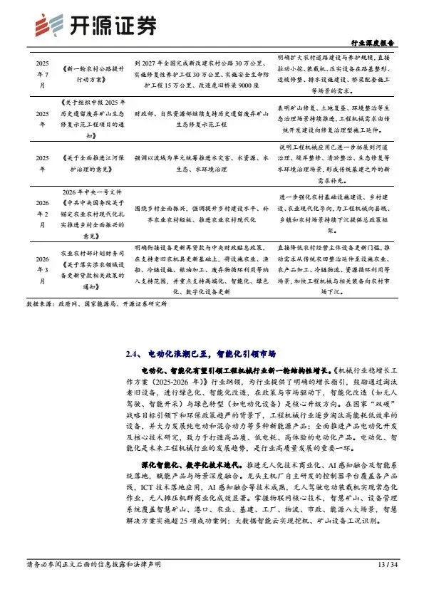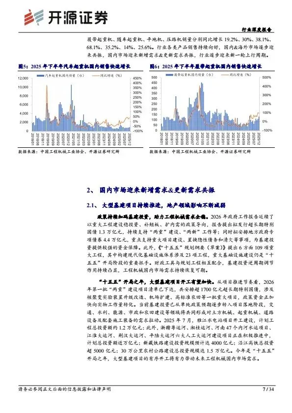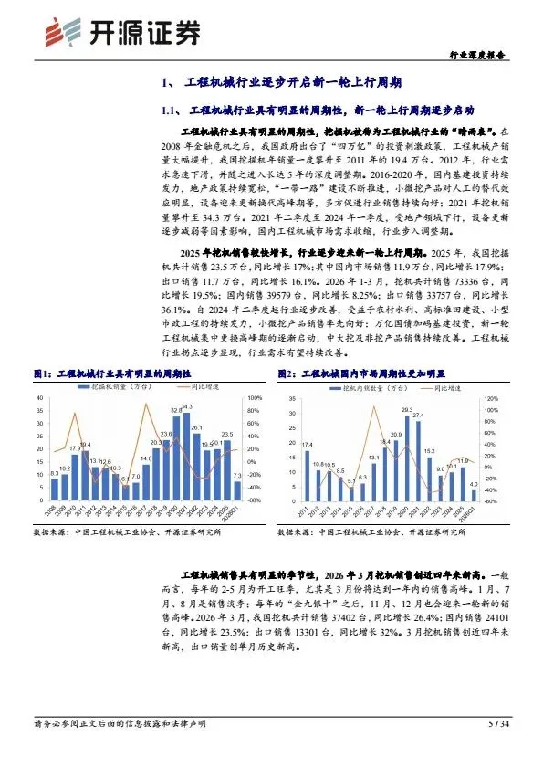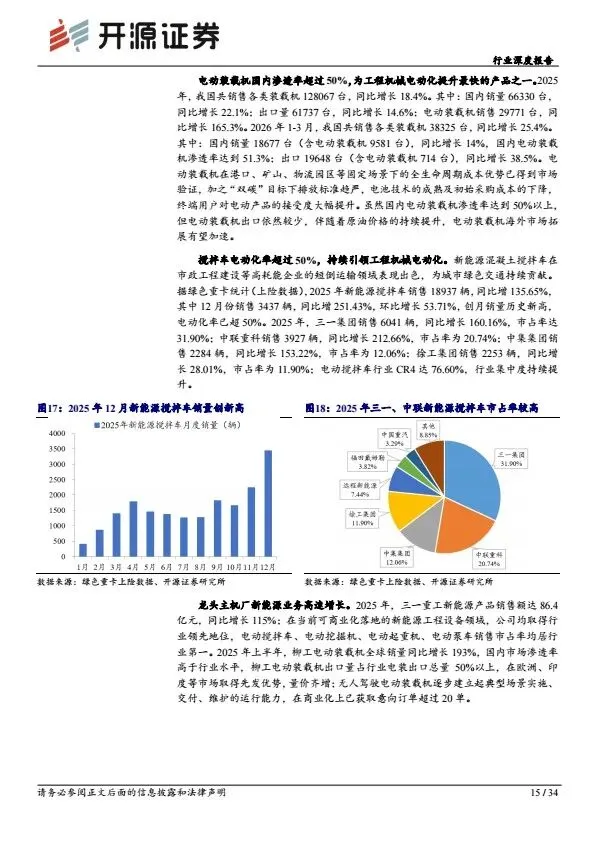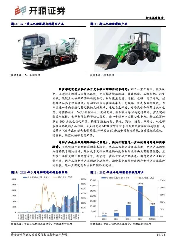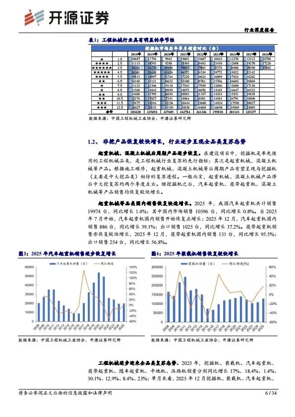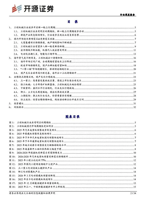 摘要:2025年工程机械行业触底回升,2026年开启新一轮上行周期,呈现国内新增与更新共振、国内与海外共振格局。国内受益万亿国债、重大基建、高标准农田与设备更新周期,小微挖率先复苏,起重、混凝土机械全面回暖;海外欧美复苏、一带一路高增,国产龙头全球化布局完善,出口持续高增。电动化加速渗透,装载机、搅拌车电动化率超50%。行业拐点明确,龙头业绩与现金流显著改善,建议关注三一重工、徐工机械、中联重科、柳工、山推股份、恒立液压。