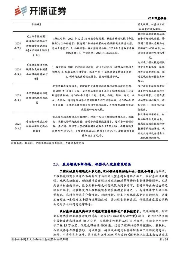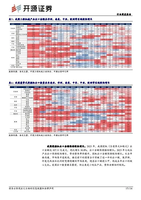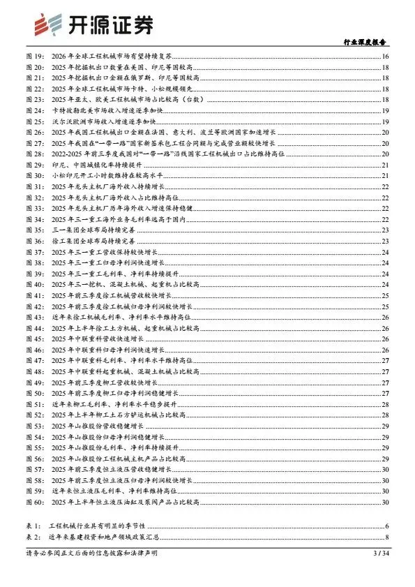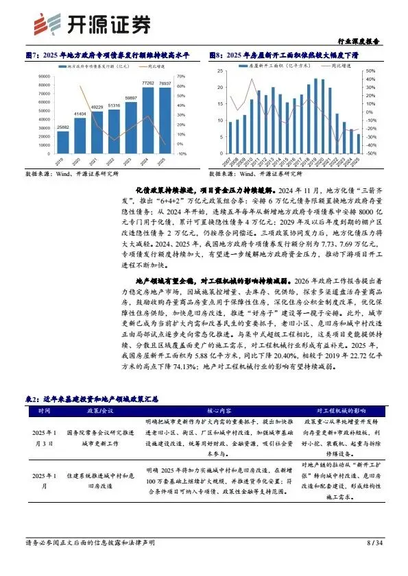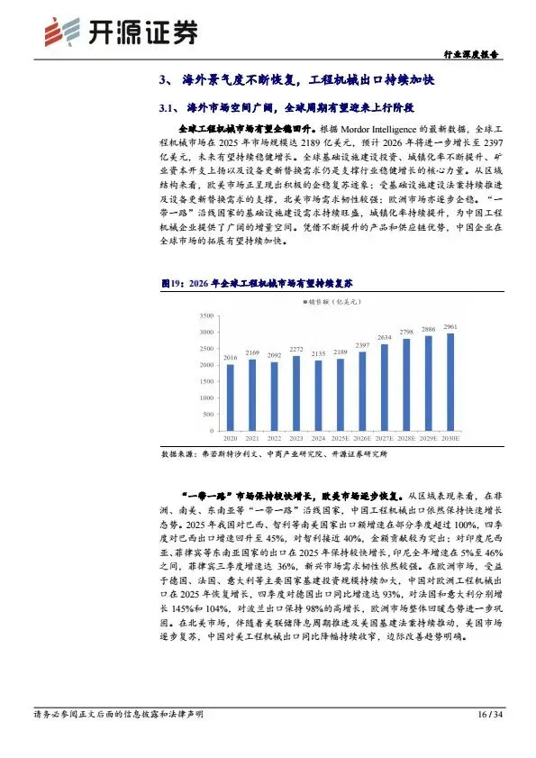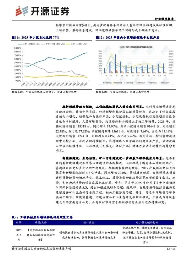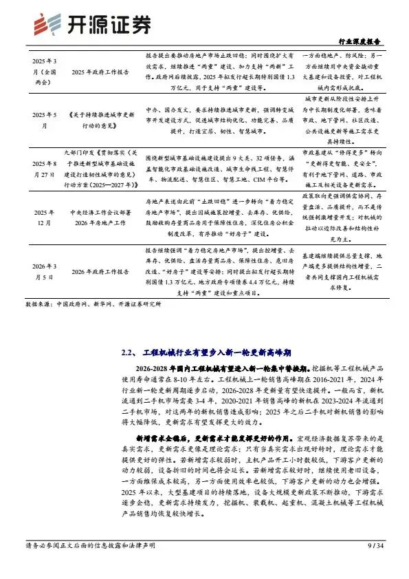 摘要:2025年工程机械行业触底回升,2026年开启新一轮上行周期,呈现国内新增与更新共振、国内与海外共振格局。国内受益万亿国债、重大基建、高标准农田与设备更新周期,小微挖率先复苏,起重、混凝土机械全面回暖;海外欧美复苏、一带一路高增,国产龙头全球化布局完善,出口持续高增。电动化加速渗透,装载机、搅拌车电动化率超50%。行业拐点明确,龙头业绩与现金流显著改善,建议关注三一重工、徐工机械、中联重科、柳工、山推股份、恒立液压。