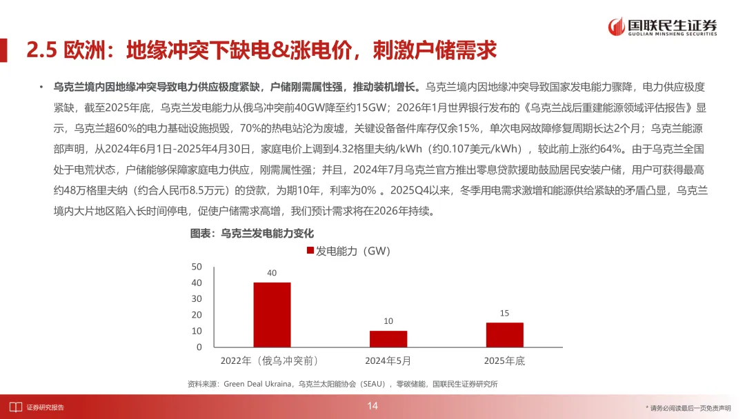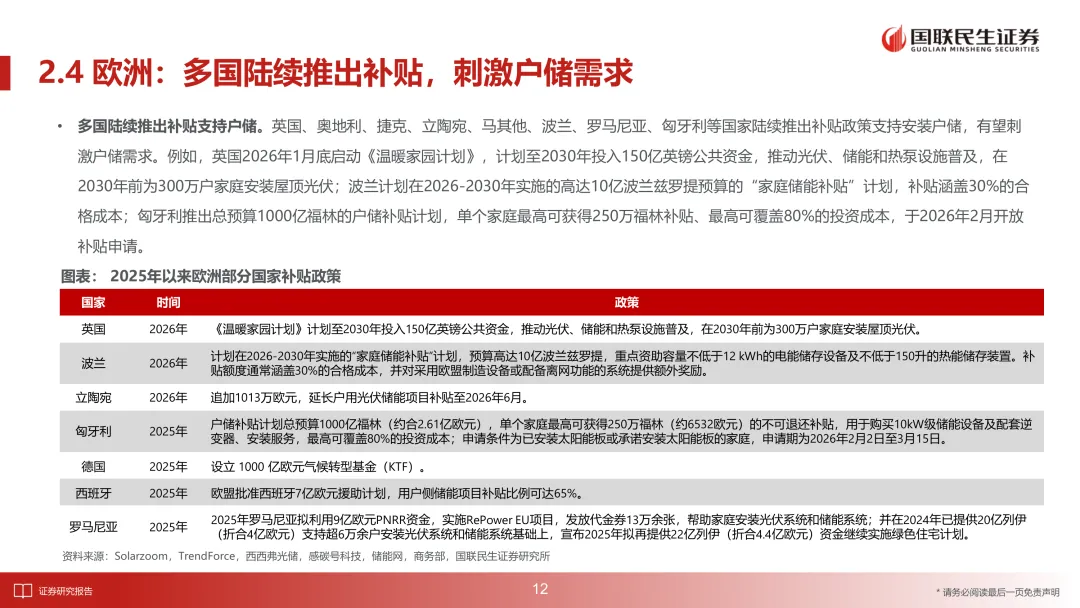 材料提到 2025 年 7 月政府推出补贴,刺激户储需求高增,2025H2 新增户储装机 18.3 万套,同比 +305%。