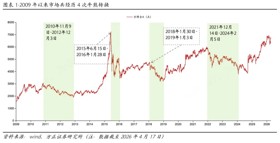 2009年以来,A股市场共发生过四次牛熊转换。过往的四轮牛熊转换分别发生在2010年11月、2015年6月、2018年1月和2021年12月,万得全A指数回撤幅度均达到30%以上。其中,2015年6月开始的熊市历经时长最短、幅度最高,市场在155个交易日中下跌52.23%;2018年1月开启的熊市在228个交易日中录得跌幅32.66%;2010年11月和2021年12月的熊市周期持续时间较长,分别在506个交易日和523个交易日中分别下跌37.49%和37.17%。