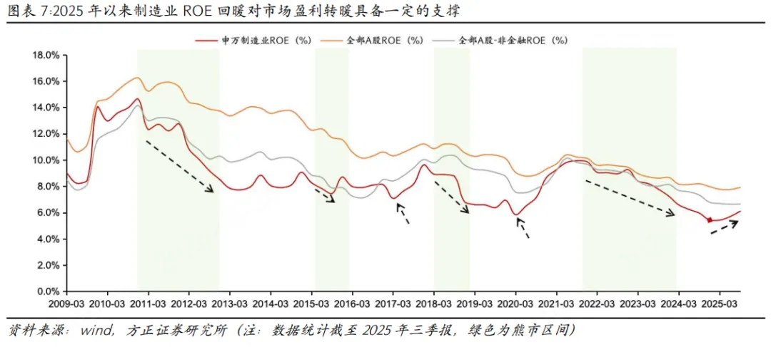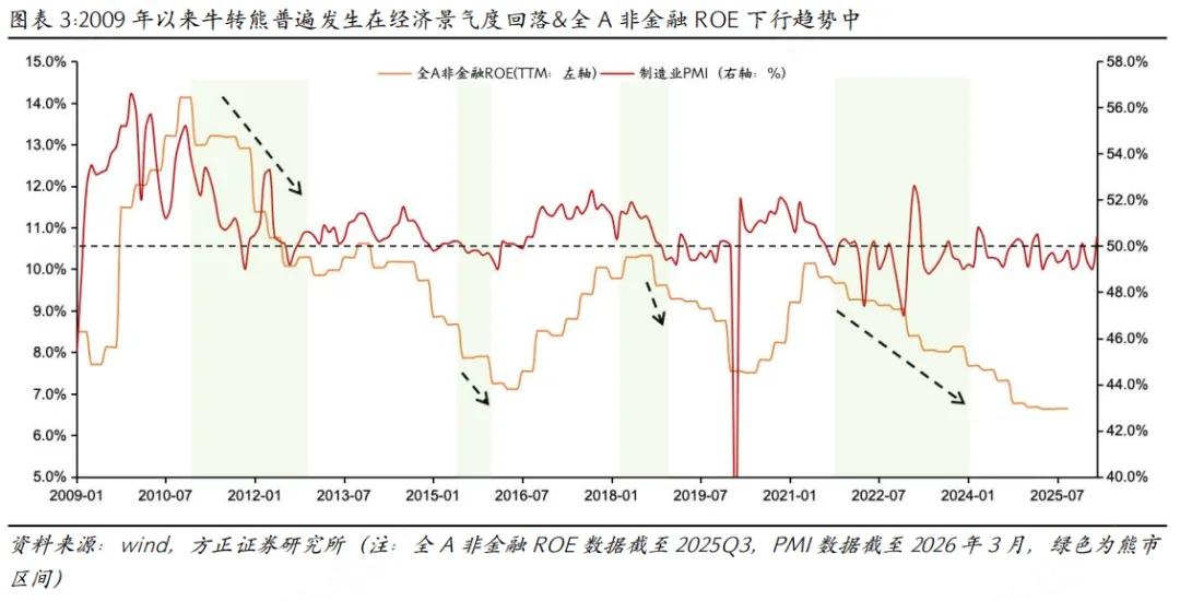 牛熊切换普遍发生在经济景气度回落&全A非金融ROE下行趋势中。2010年11月与2018年1月开始的牛转熊,尽管发生在经济景气度回落,但仍处于50枯荣线以上;2015年6月和2021年12月开始的牛转熊,发生在经济整体位于50枯荣线下方的回落、景气度持续回落的阶段。