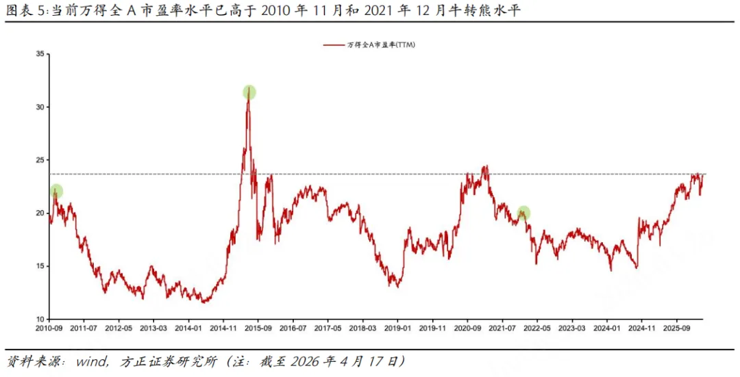 当前来看,市场不具备牛转熊的条件,后续市场仍将延续修复局面。当前万得全A估值水平虽然已超过2010年11月和2021年12月牛转熊时期水平,但目前美联储紧缩概率不大、国内前所未有的低利率环境带来股权风险溢价水平适中,股票依然有不错的性价比,此外盈利周期的底部回升对当前估值水平形成支撑,A股在Q2将演绎牛市期间调整后的修复过程。