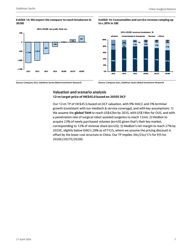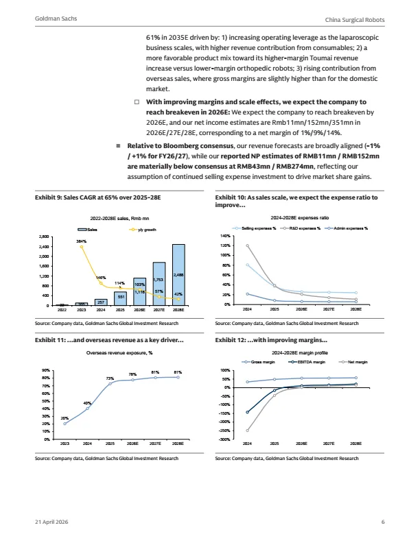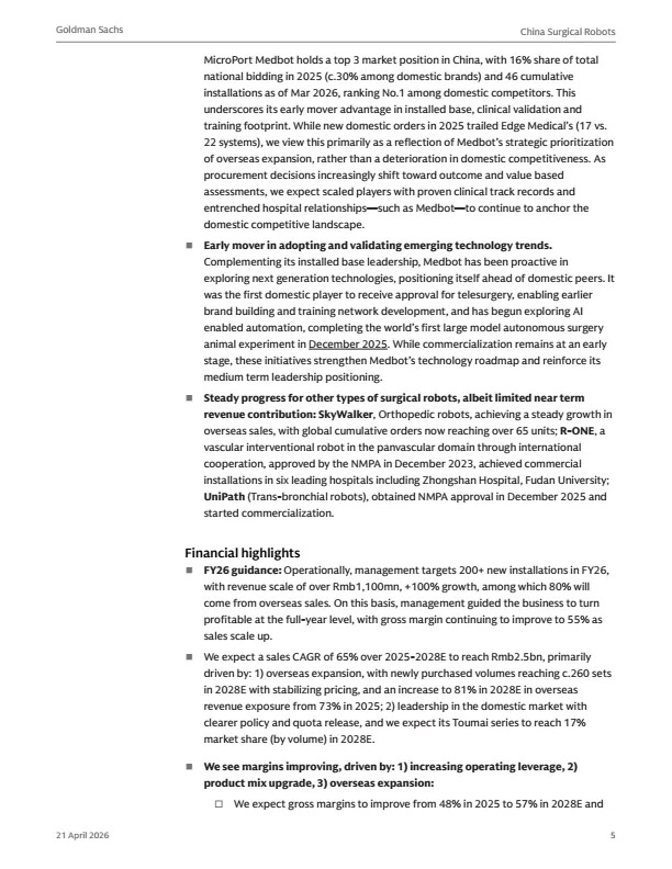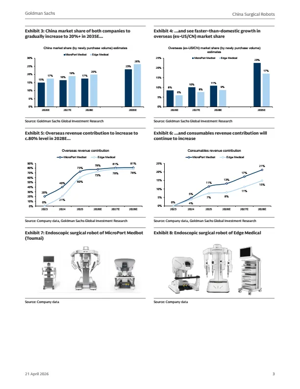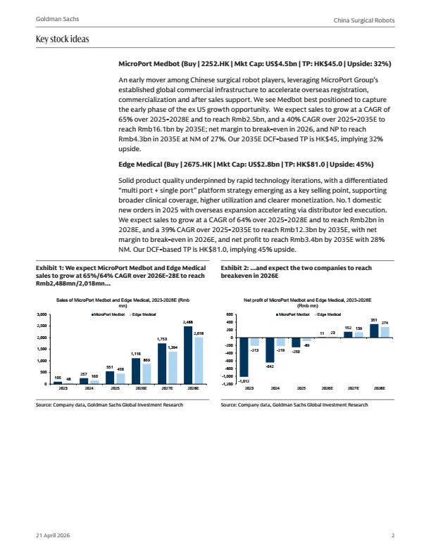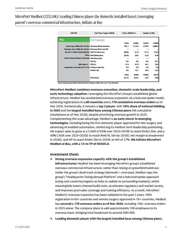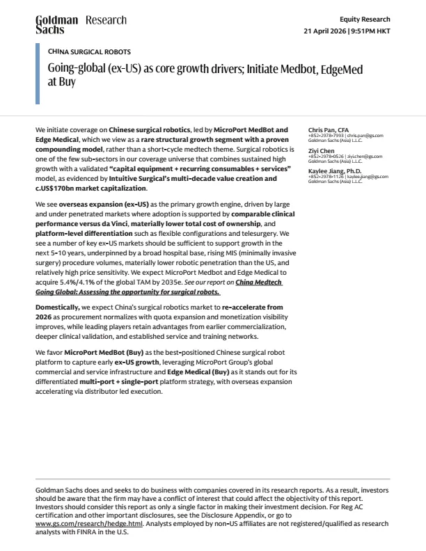 摘要:中国手术机器人行业正迎来结构性增长,海外(除美国外)市场成为核心增长驱动力。该类市场渗透率低、价格敏感,国产手术机器人凭借与达芬奇相当的临床效果、更低的TCO,快速打开市场。研报首次覆盖微创医疗机器人与天智航:微创依托集团全球渠道,已在60+国家完成注册,累计海外订单超170台;天智航凭借多端口+单端口差异化平台,2025年国内新订单登顶。预计两家公司2025-2028年营收复合增速超60%,2026年实现盈亏平衡。本报告为医疗机器人行业、投资者提供出海布局参考。