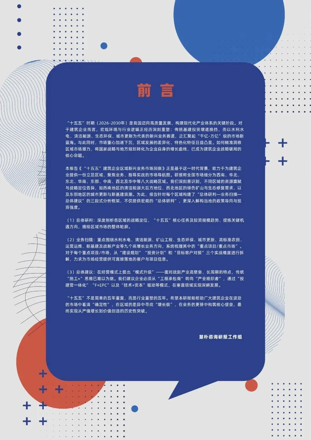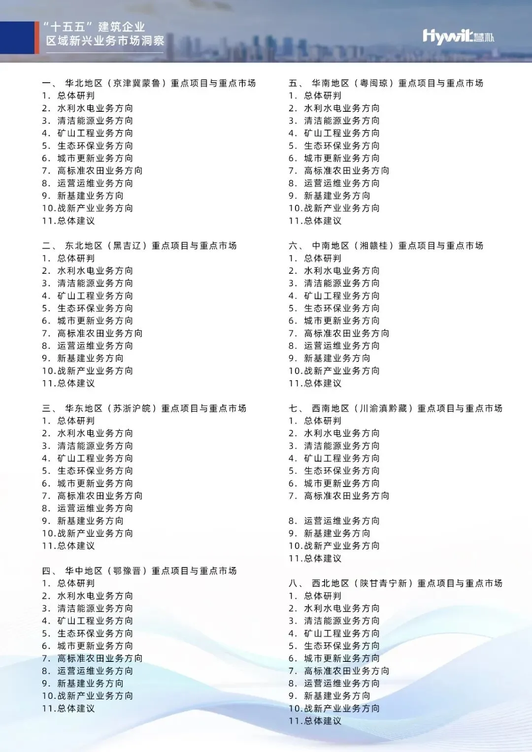 我们深刻意识到,不同区域的资源禀赋与战略定位各异,如西南地区的清洁能源大后方地位、西北地区的绿色矿山与生态修复需求,以及东部地区的城市更新与新基建浪潮。为此,报告针对每个区域构建了“总体研判—业务扫描—总体建议”的三段式分析框架,不仅提供宏观的“总体研判”,更深入解构当地的政策导向与投资强度。