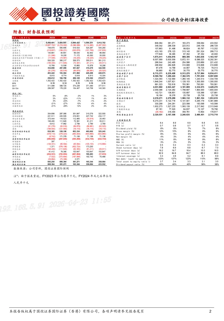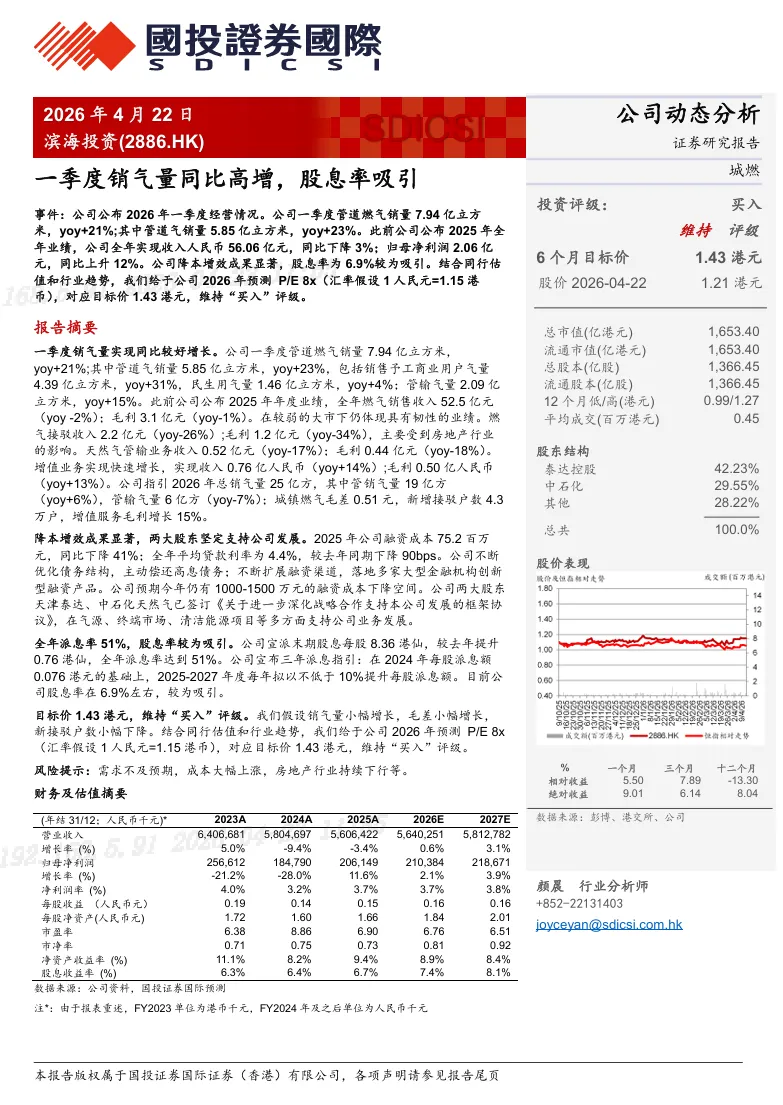 事件:公司公布2026年一季度经营情况。公司一季度管道燃气销量7.94亿立方米,yoy+21%;其中管道气销量5.85亿立方米,yoy+23%。此前公司公布2025年全年业绩,公司全年实现收入人民币56.06亿元,同比下降3%;归母净利润2.06亿 元,同比上升12%。公司降本增效成果显著,股息率为6.9%较为吸引。结合同行估值和行业趋势,我们给于公司2026年预测P/E 8x(汇率假设1人民元=1.15港币),对应目标价1.43港元,维持“买入”评级。