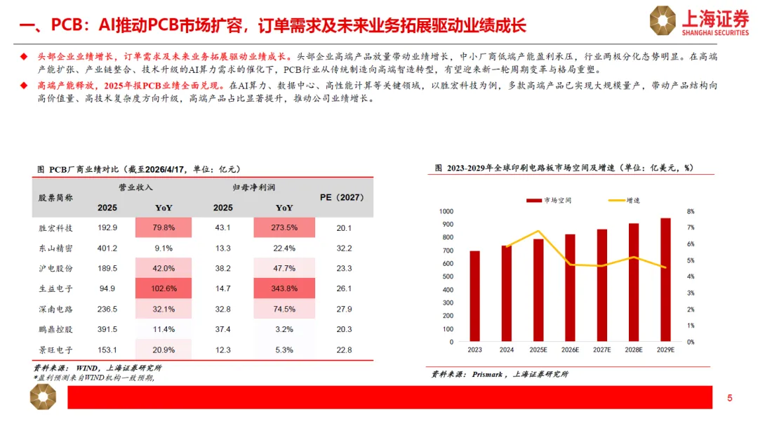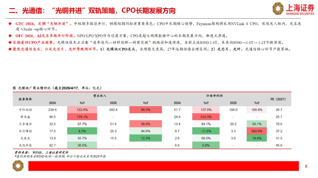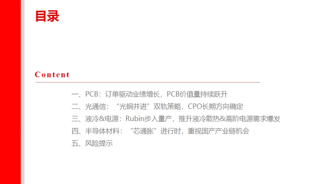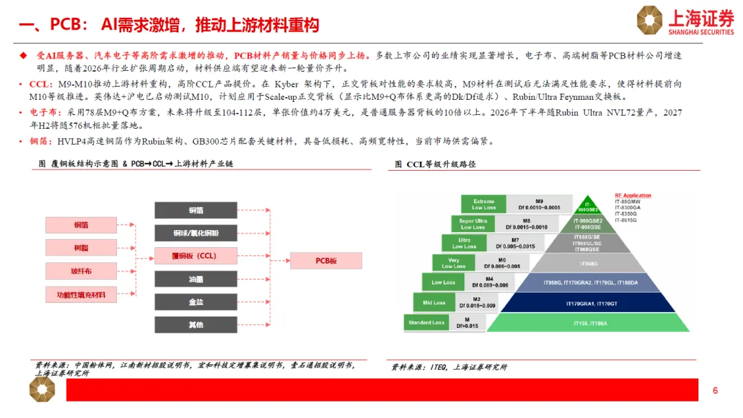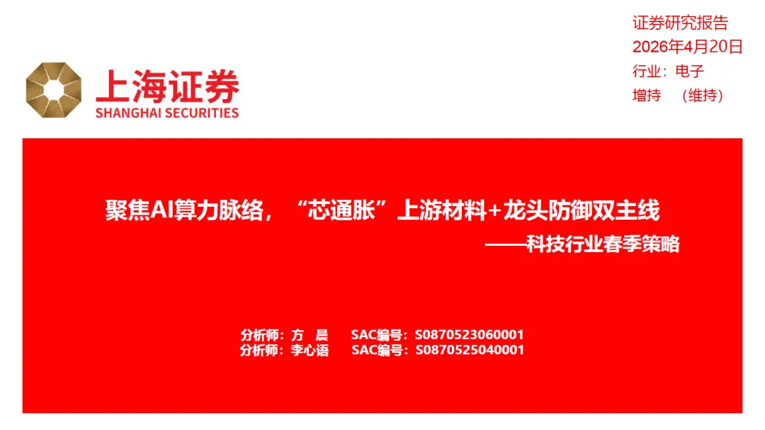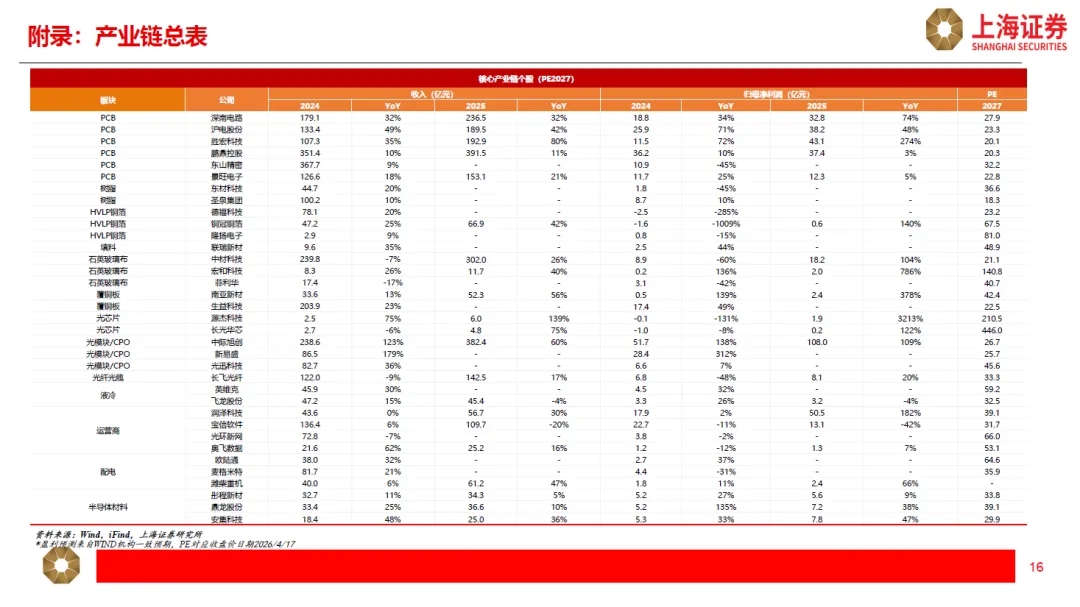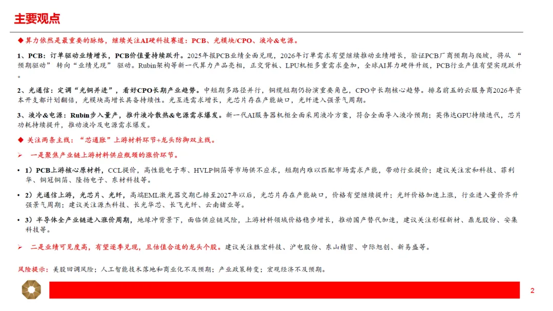 根据上海证券研报分析主要围绕两条主线展开。第一条是算力硬件赛道,包括PCB、光通信、液冷和电源,重点看各家公司的业绩兑现情况。第二条是上游材料的涨价逻辑,涉及覆铜板、电子布、铜箔、光芯片、光纤、半导体靶材、特种气体等环节。具体详见研报