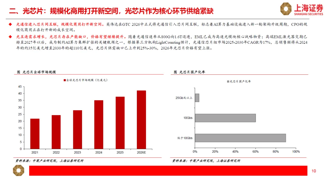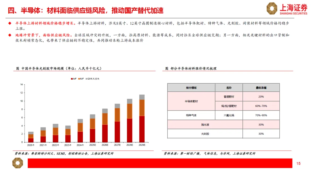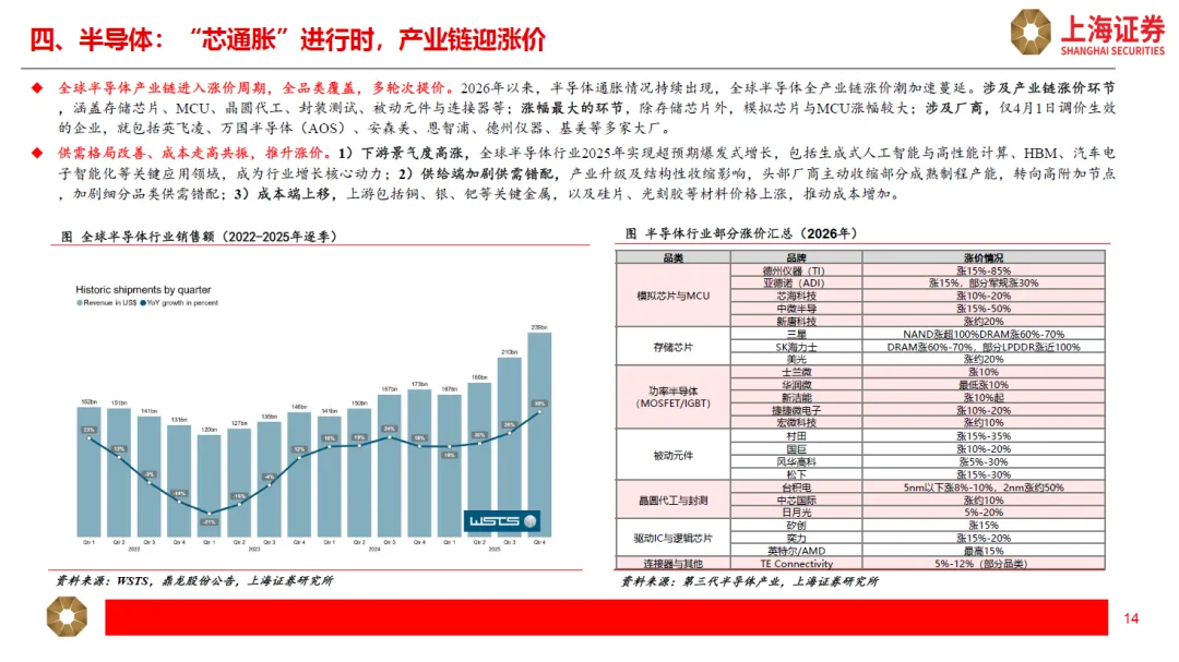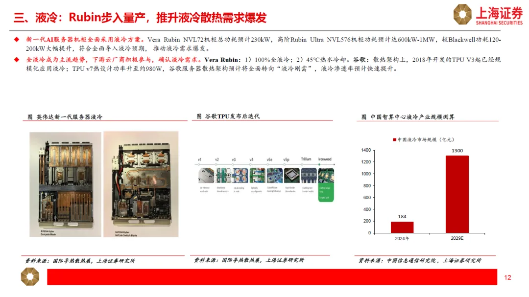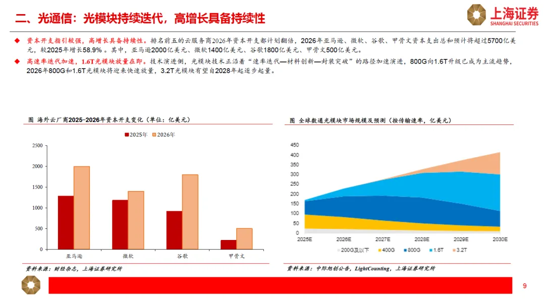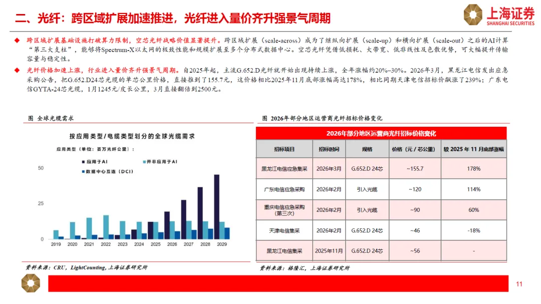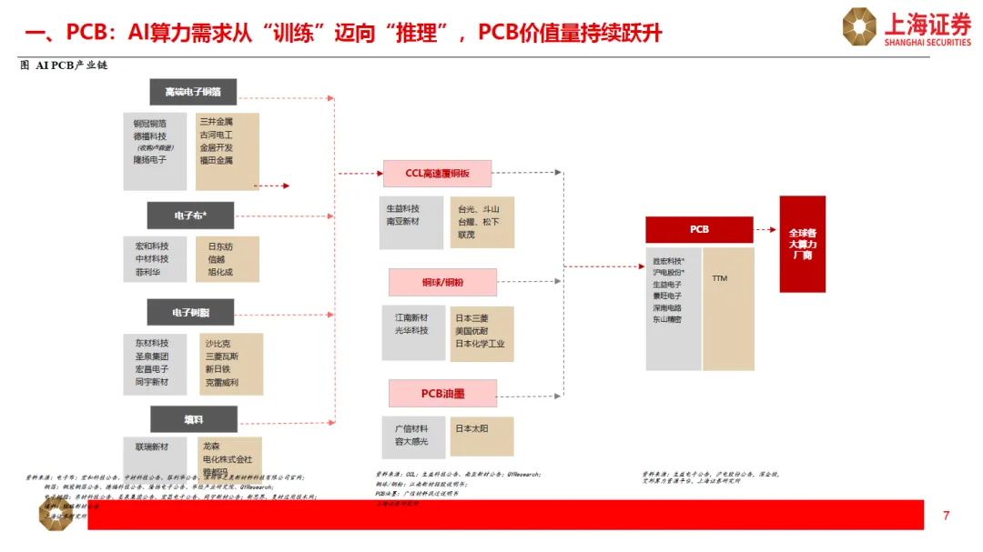 根据上海证券研报分析主要围绕两条主线展开。第一条是算力硬件赛道,包括PCB、光通信、液冷和电源,重点看各家公司的业绩兑现情况。第二条是上游材料的涨价逻辑,涉及覆铜板、电子布、铜箔、光芯片、光纤、半导体靶材、特种气体等环节。具体详见研报