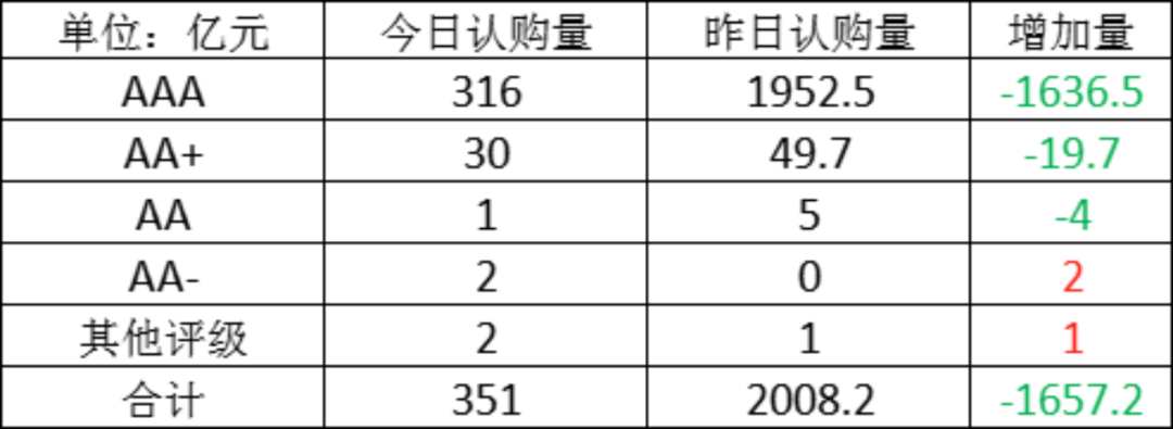 今日存单认购量规模351亿元,较上一工作日认购量大幅减少,减少了1657.2亿元。