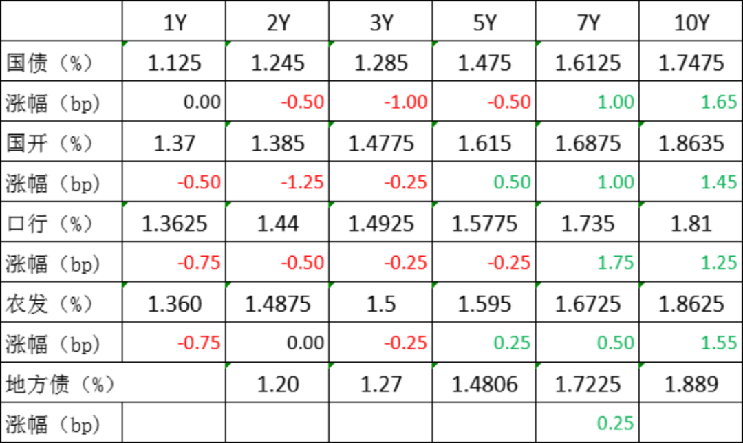 截止17:10,利率债二级市场中,利率成交价格总体呈震荡趋势,其中上涨程度较大的有10年期国债,收益率上涨1.65bp,报1.7475%;7年期口行债,收益率上涨1.75bp,报1.735%;10年期国开债,收益率上涨1.45bp,报1.8635%,10年期农发债,收益率上涨1.55bp,报1.8625%。