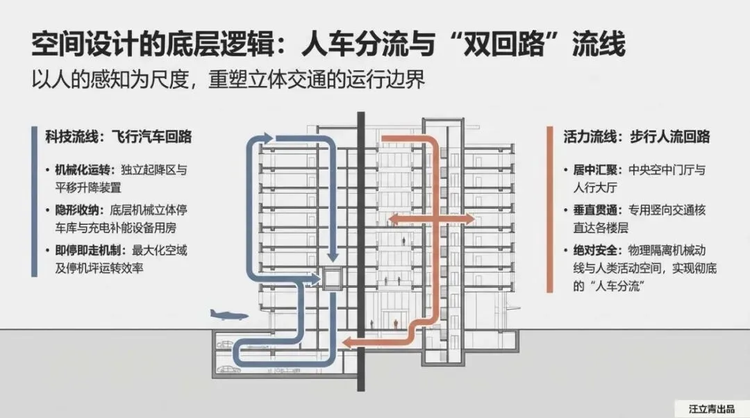简单讲,飞行器落地后,会像输送带上的零件一样横向平移进入停放区。这种设计实现了“车从两边进,人从中路走”。起降、停车、充电、人员进出,在同一个平面内完成折叠。这种“空间叠加”的高效,是传统地库想都不敢想的。