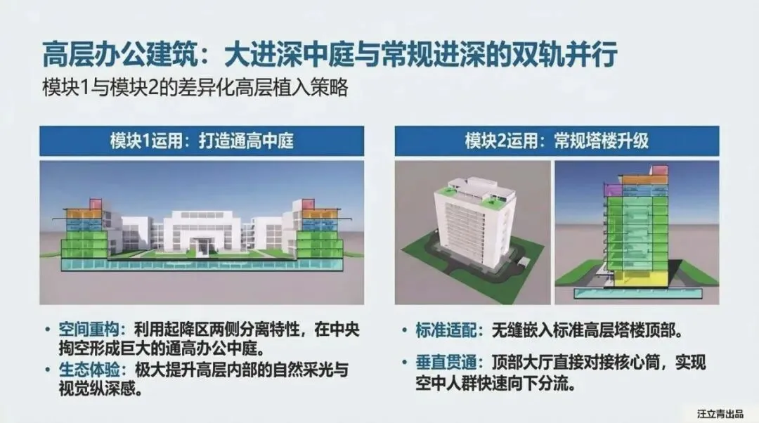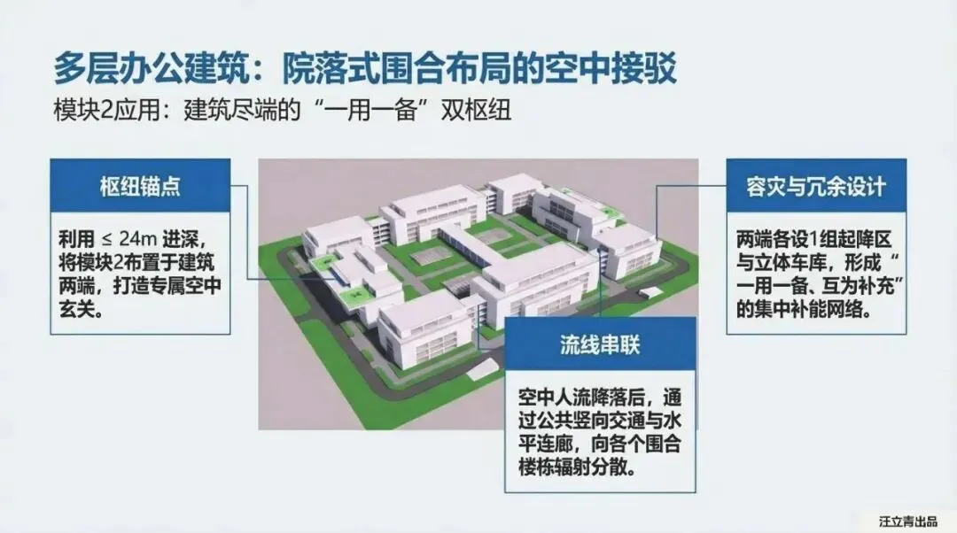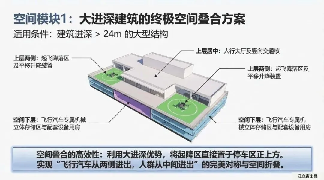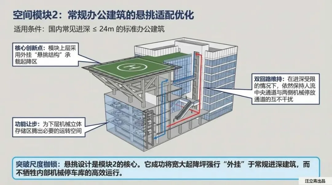首先是针对进深大于24米的大进深建筑(模块1)。这种方案简直就是个“空中车库”。它的逻辑非常硬核:利用大进深的优势,在建筑上层两侧设置起降区。重点来了,这里必须配备“平移升降装置”。