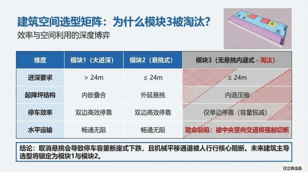 至于那种试图在楼体内部收缩空间、做内退式的模块3,已经直接被判定为“淘汰品”。说白了,它就像一段严重堵塞的血管,因为内退空间强行切断了“竖向交通核”,导致停车容量出现断崖式下跌。这种牺牲核心效率的方案,在商业地产的逻辑里根本活不下去。