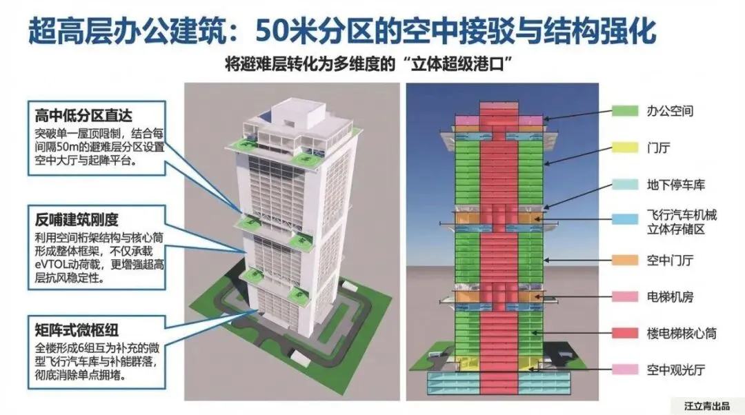 先看办公场景:未来的超高层不再是一个整体,而是以50米为分区单位的“立体超级港口”。你可能在30层落地,你的同事在50层落地,大家各走各的“空中入口”。这种通过“矩阵式微枢纽”实现的就近分布逻辑,将彻底消除单点拥堵。