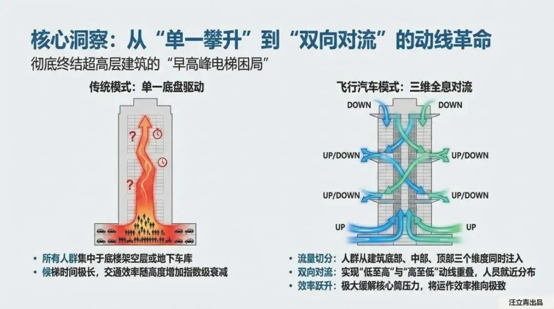 我们要彻底告别那种“所有人挤在底盘、像被动抽水一样往上爬”的旧时代了。在eVTOL的加持下,建筑进化成了“三维全息对流”模式。流量从顶部、中部、底部全方位渗透。这种效率的跃升,不仅是帮你省下了那几分钟等电梯的时间,更是对城市治理半径的一次降维扩张。